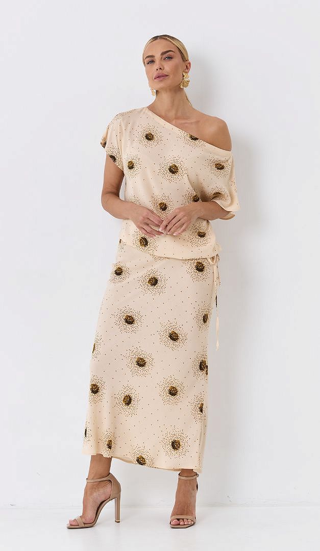 На фото создан образ с юбкой макси с принтом беж (арт.2688).