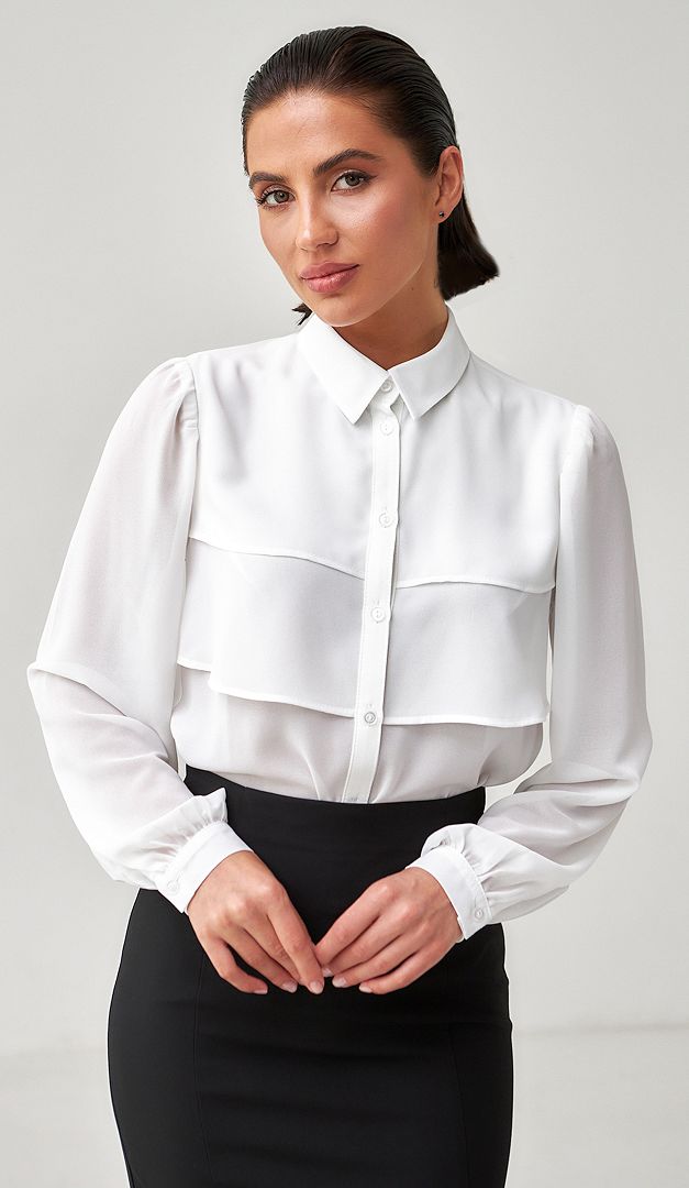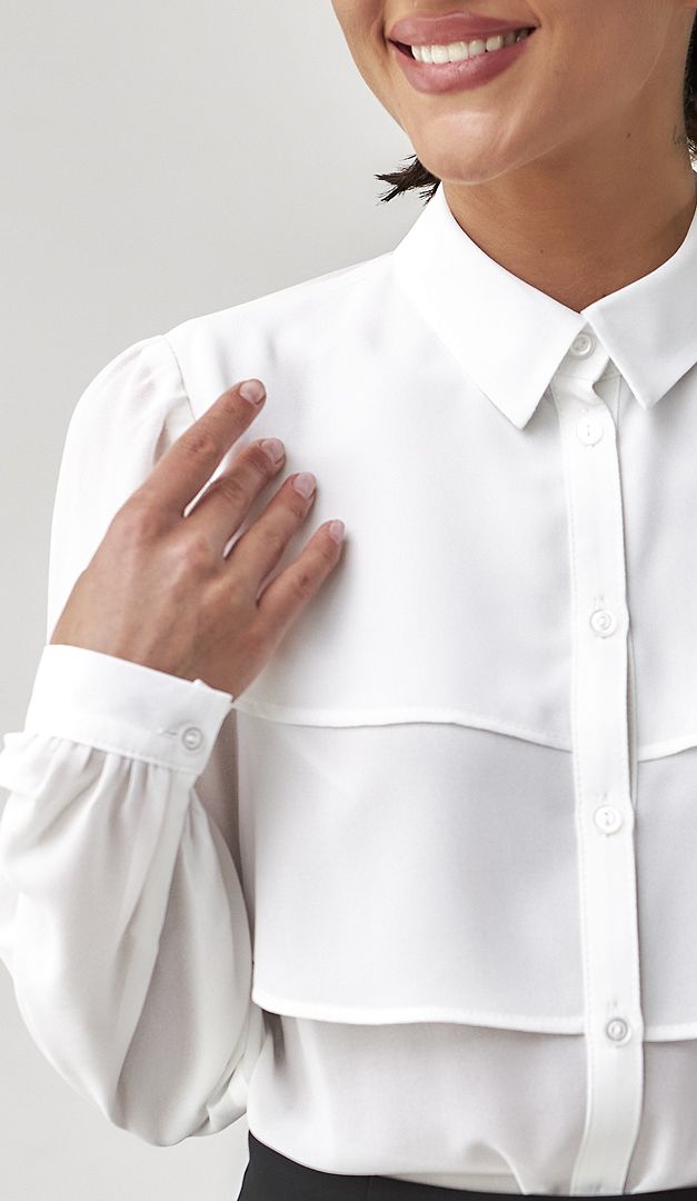 Блузка белая с кокеткой – вещь невероятно нежная и элегантная одновременно! Модель прямого полуприлегающего кроя, горловина оформлена классическим воротником-стойкой, переходящим в планку-застежку на пуговицы. Длинный рукав белой блузки с кокеткой по низу имеет неширокую манжету, которая придает ему красивый объем и также застегивается на одну пуговицу. Изысканность изделия подчеркивает двойная кокетка на передней полочке из аналогичной ткани. Без подкладки.
