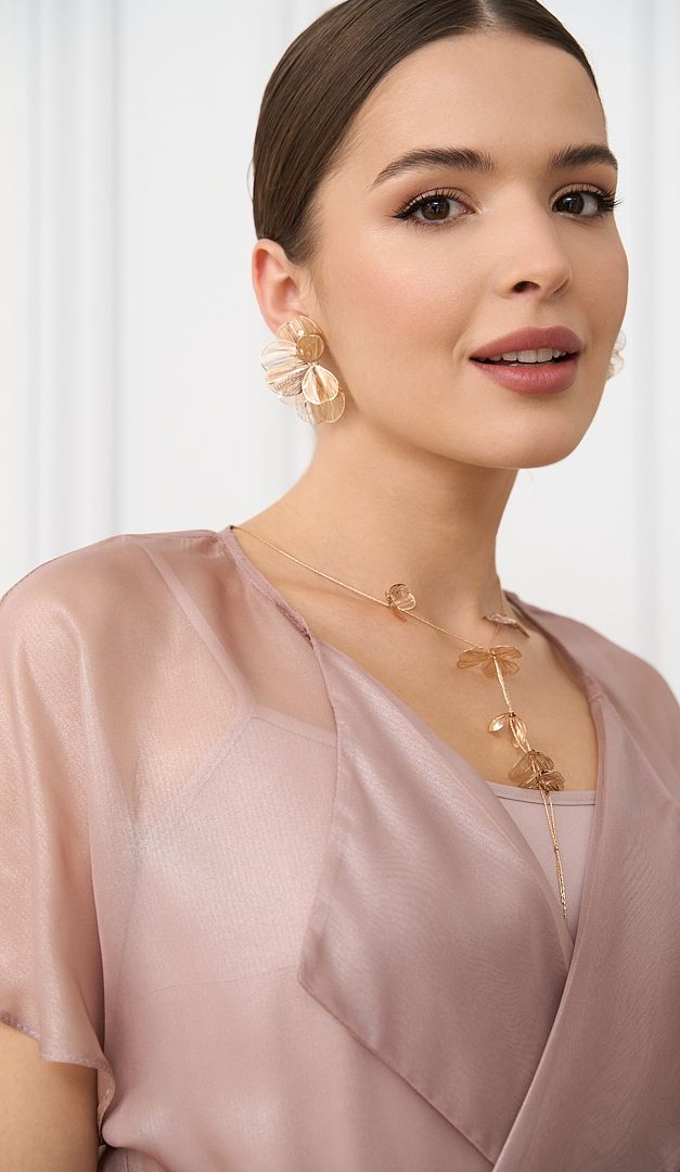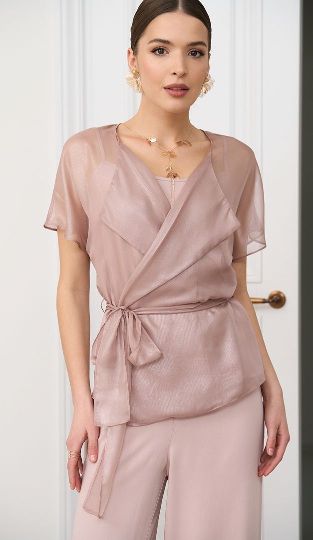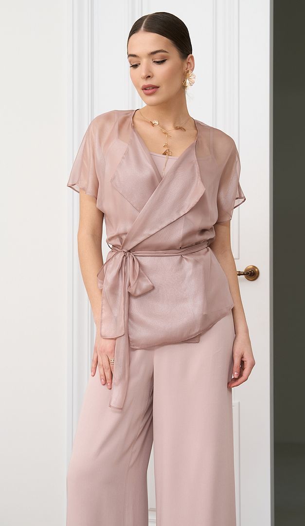 Блузка прозрачная на запах пудровая – стильное дополнение к нежным женственным образам. Модель свободного кроя, с коротким рукавом, прикрывающим линию плеч и широким отложным воротником. Блузка прозрачная на запах пудровая фиксируется на талии с помощью широкого съемного пояса из аналогичной ткани. Легкая прозрачная ткань с эффектом мерцания окутывает силуэт, не отягощая его и дарит ощущение пространства и свободы. Без застежек.