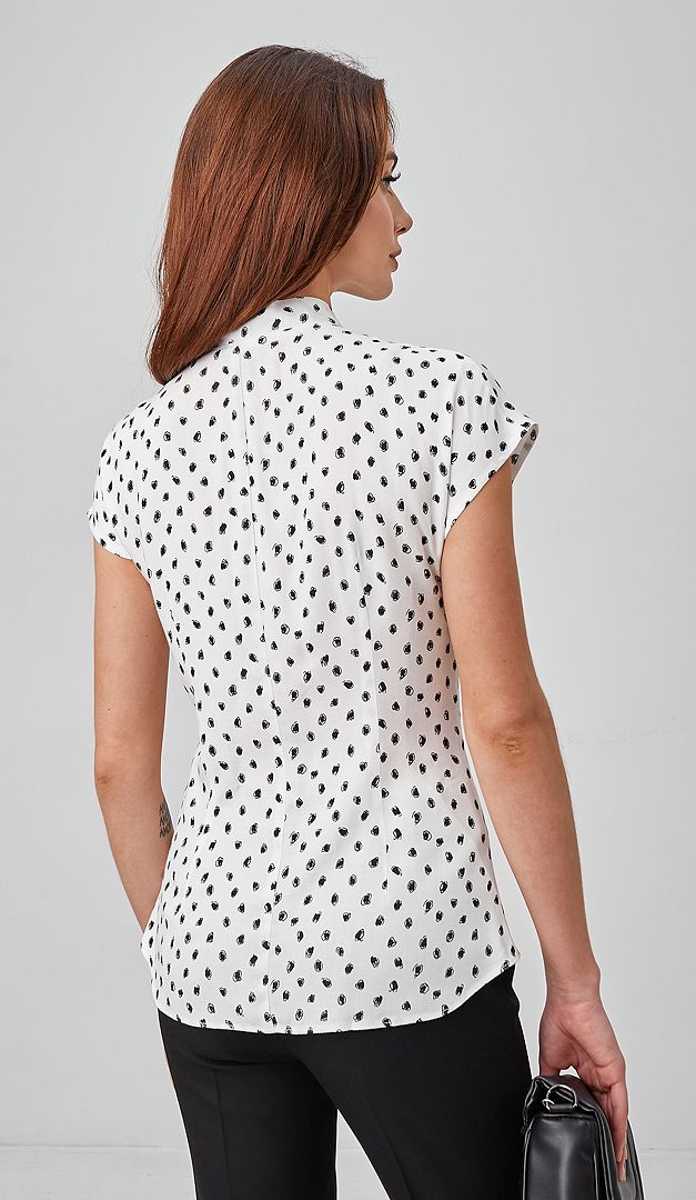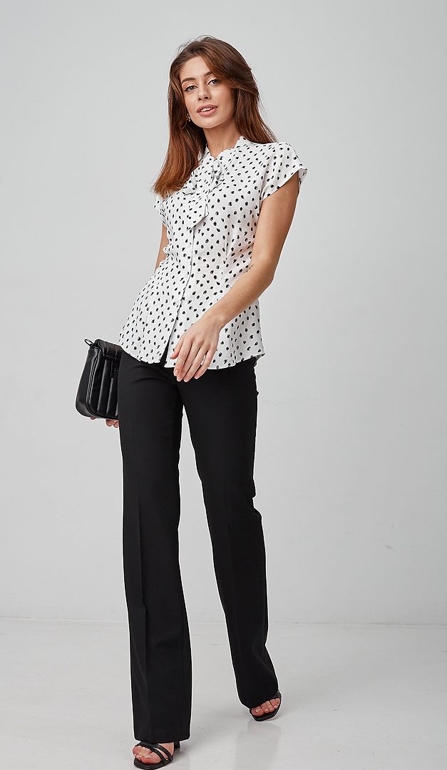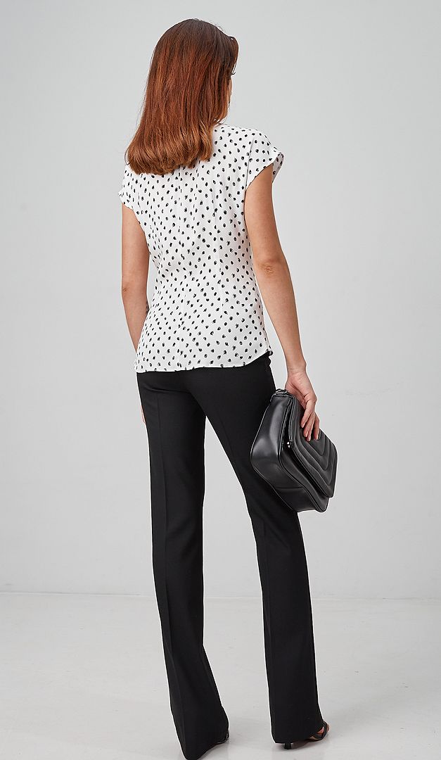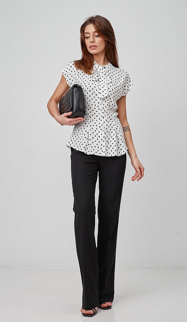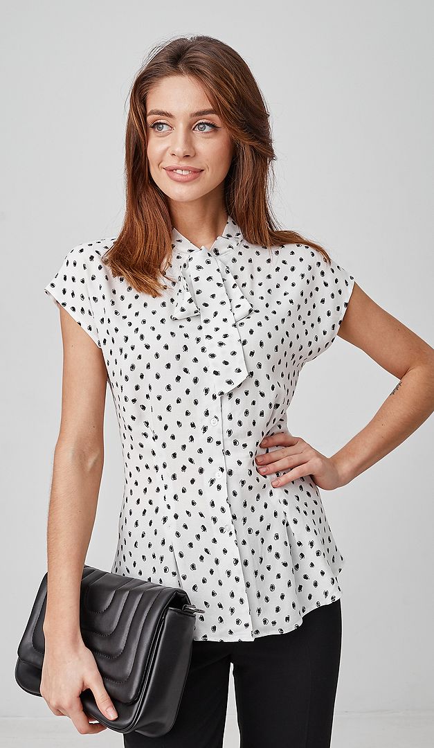 Универсальная блузка с принтом в горох без рукавов с классическим сочетанием белого и черного цветов, безусловно, станет удачным дополнением к вашему офисному дресс-коду. Благодаря оригинальному крою, делающему акцент на линии талии, блузка с принтом в горох без рукавов визуально придает силуэту стройности и утонченности. А воротник, который завязывается в миловидный бант, подчеркивает женственность и нежность созданного образа.
