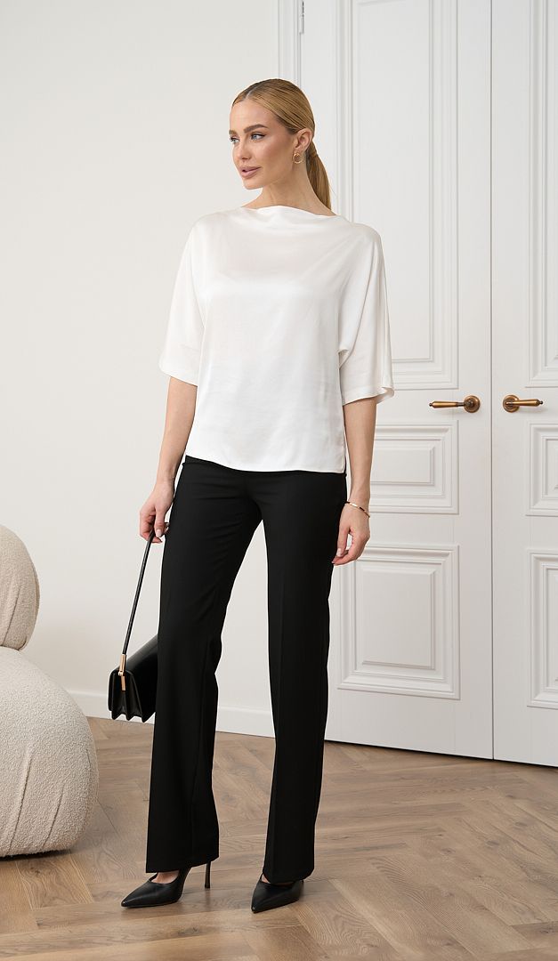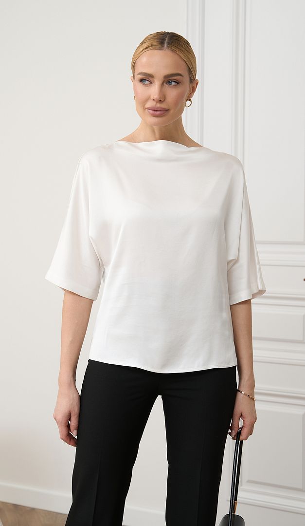 Блузка базовая молочная подчеркнет элегантность и придаст женственности к созданному образу. Модель свободного прямого кроя, с коротким цельнокроеным рукавом и оригинальным неглубоким вырезом горловины – «лодочка». Блузка женская базовая молочная выполнена из натуральной шелковистой ткани – вискоза 100%, которая обеспечивает удобство и комфорт. Низ изделия по боковым швам оформлен невысокими разрезами. Благодаря минималистичному дизайну и универсальному цвету блузка удачно дополнит любой образ.