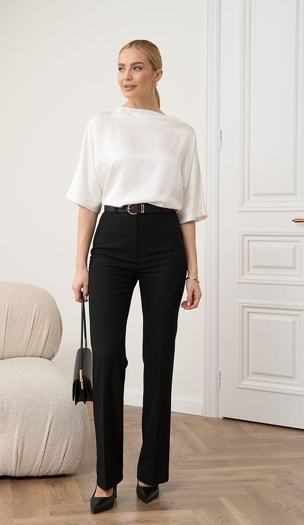 На фото создан образ с брюками с высокой посадкой черными (арт.2696).