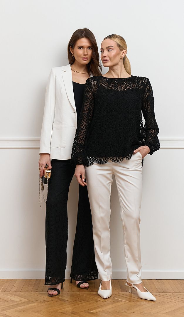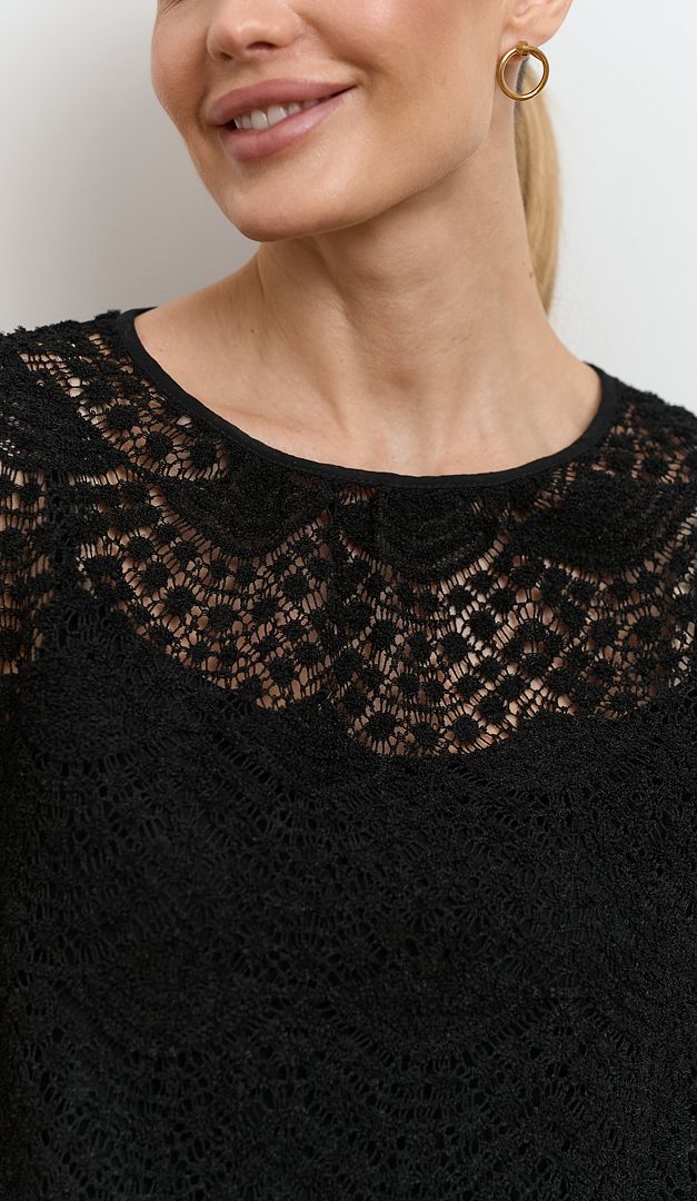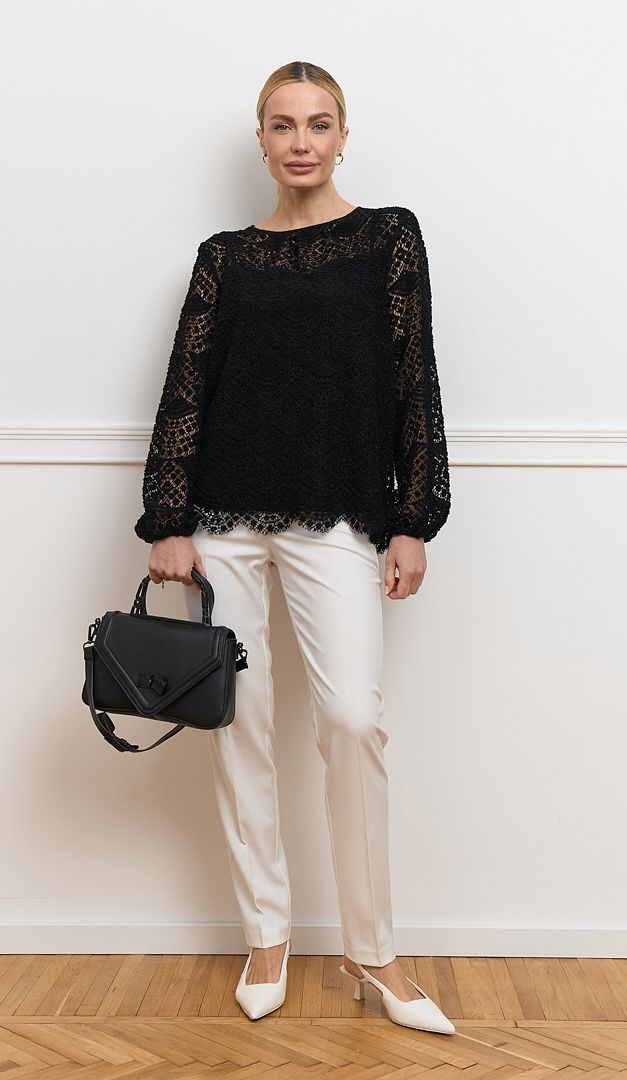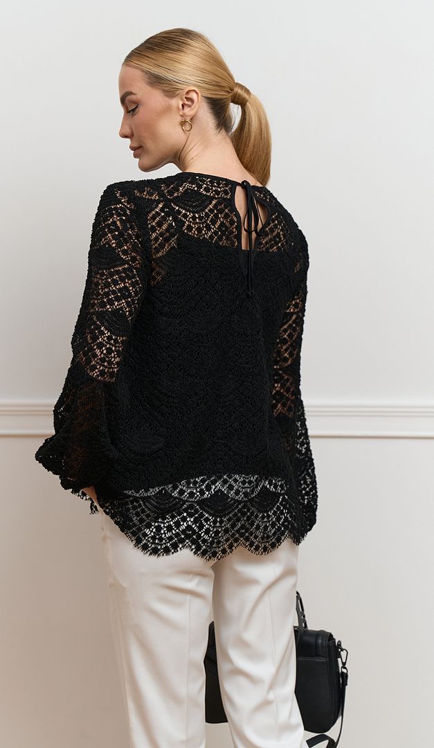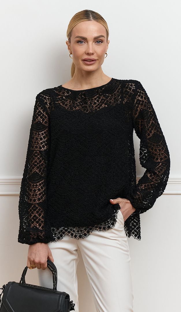Невероятно эффектная блузка женская из кружева черная станет идеальным решением для создания изысканных образов. Модель свободного прямого кроя oversize изготовлена из объемного кружева с красивым узором. Блузка женская из кружева черная имеет длинный свободный рукав, который по низу оформлен эластичной резинкой и округлый вырез горловины, корректирующийся сзади шнуровкой. Такой элемент гардероба придаст женственности и стиля любому образу. Модель дополнена натуральной подкладкой в виде топа на тонких бретелях.