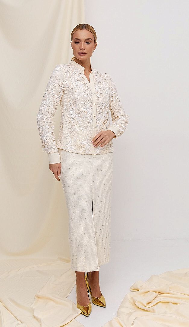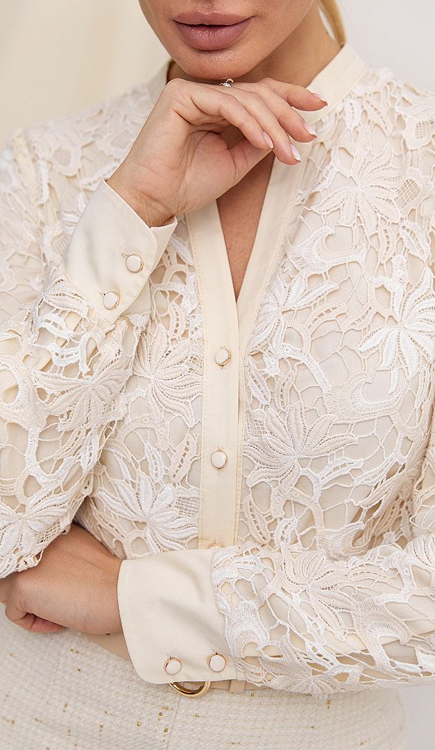 Блузка женская с кружевом сливочная — изысканность и элегантность, которая очаровывает с первого взгляда — ЛИМИТИРОВАННАЯ КОЛЛЕКЦИЯ от HELENA! Модель прямого полуприлегающего кроя, с невысоким воротником-стойкой, переходящий в V-образный вырез и планку-застежку на пуговицы. Блузка женская с кружевом сливочная имеет длинный рукав с широкой манжетой, которая также застегивается на две пуговицы. Эксклюзивное хлопковое кружево и натуральная ткань – вискоза 100%, сочетают комфорт и невероятную красоту в данном изделии.