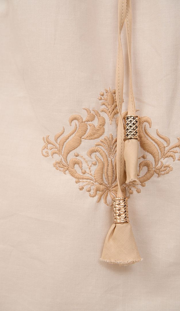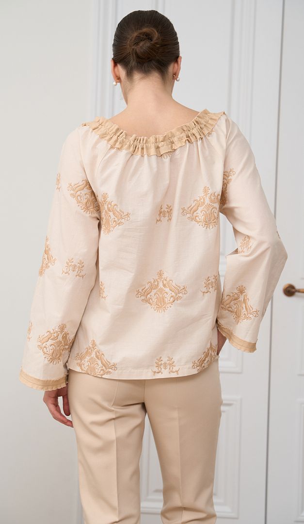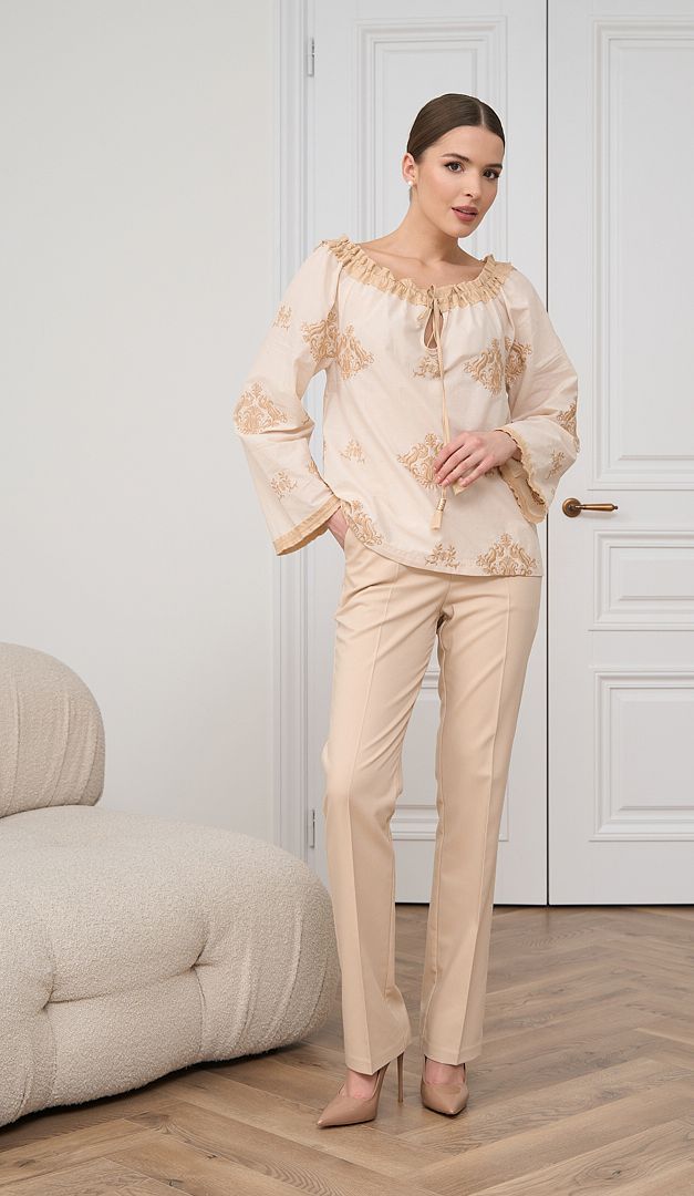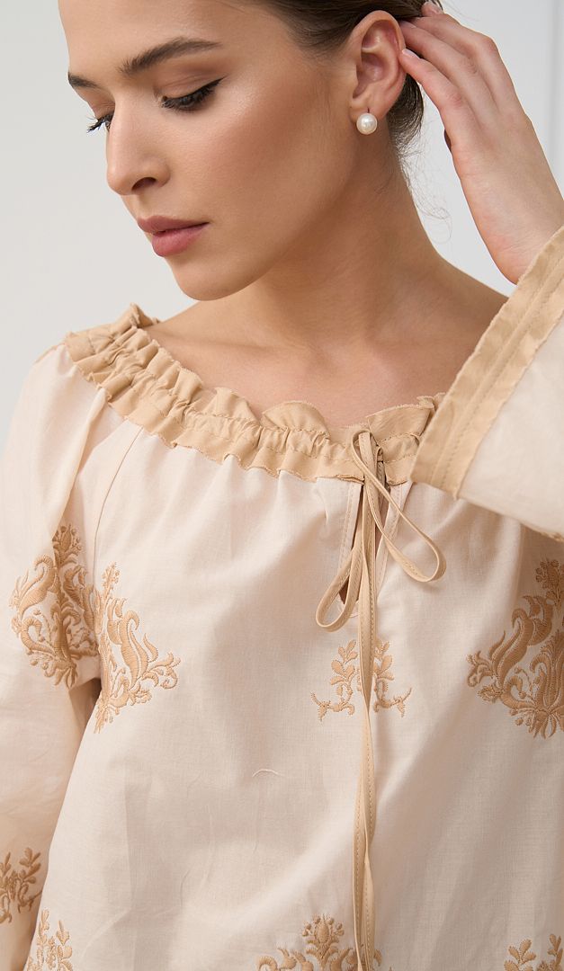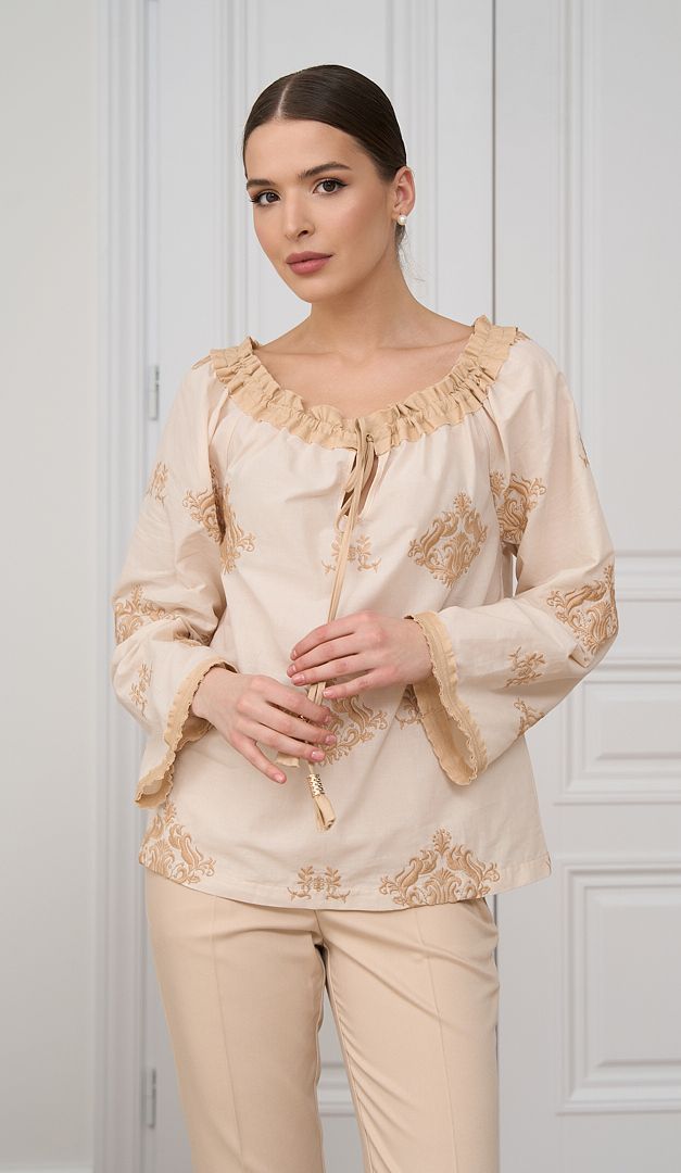 Блузка женская с вышивкой сливочная — изысканная вещь, которая придаст созданному образу шарма и женственности. Модель свободного прямого кроя с глубоким вырезом горловины, который регулируется вшитой шнуровкой. Блузка женская с вышивкой сливочная имеет длинный свободный рукав, который по низу стильно оформлен планкой, как и горловина изделия. Эффектности блузке придает красивая объемная вышивка, украшающая все изделие.