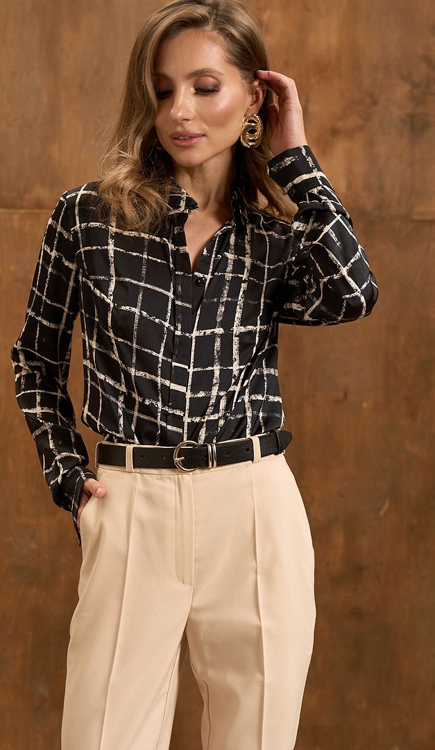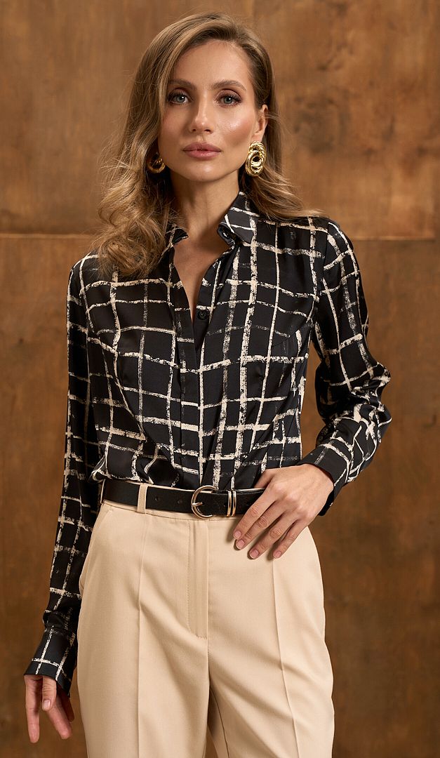 Блузка жіноча в клітинку чорна — стильна базова річ, яка неодмінно знайде своє особливе місце у вашому гардеробі. Модель напівприлеглого крою, з класичним відкладним коміром-стійкою, який переходить в зручну потайну планку-застібку на ґудзики. Також блузка жіноча в клітинку чорна має довгий рукав, що оформлений манжетою з застібкою на один ґудзик. Шовковиста тканина виробу не лише виконана з трендовим контрастним принтом “клітинка”, але й неймовірно приємна на дотик.