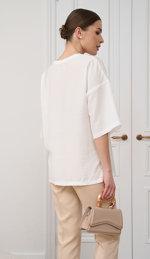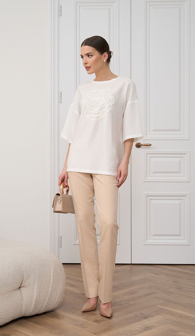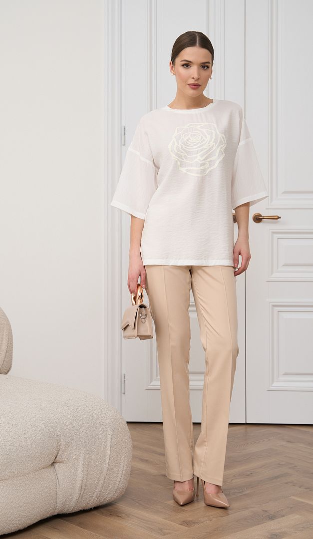 Невероятно легкий и нежный блузон молочный с принтом роза, станет одной из любимых вещей в вашем весенне-летнем гардеробе. Модель свободного прямого кроя с неглубоким округлым вырезом горловины, приспущенной линией плеча и коротким свободным рукавом. Блузон молочный с принтом розы выполнен из легкой полупрозрачной ткани, в составе которой вискоза 85%. Изделие по низу оформлено невысокими распорками по боковым швам.