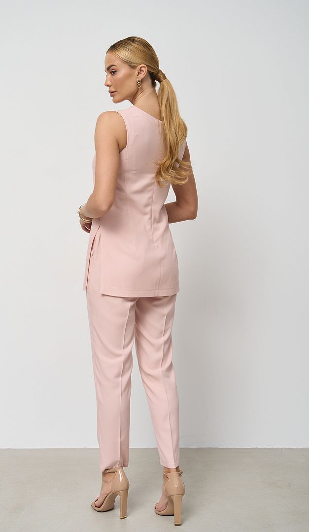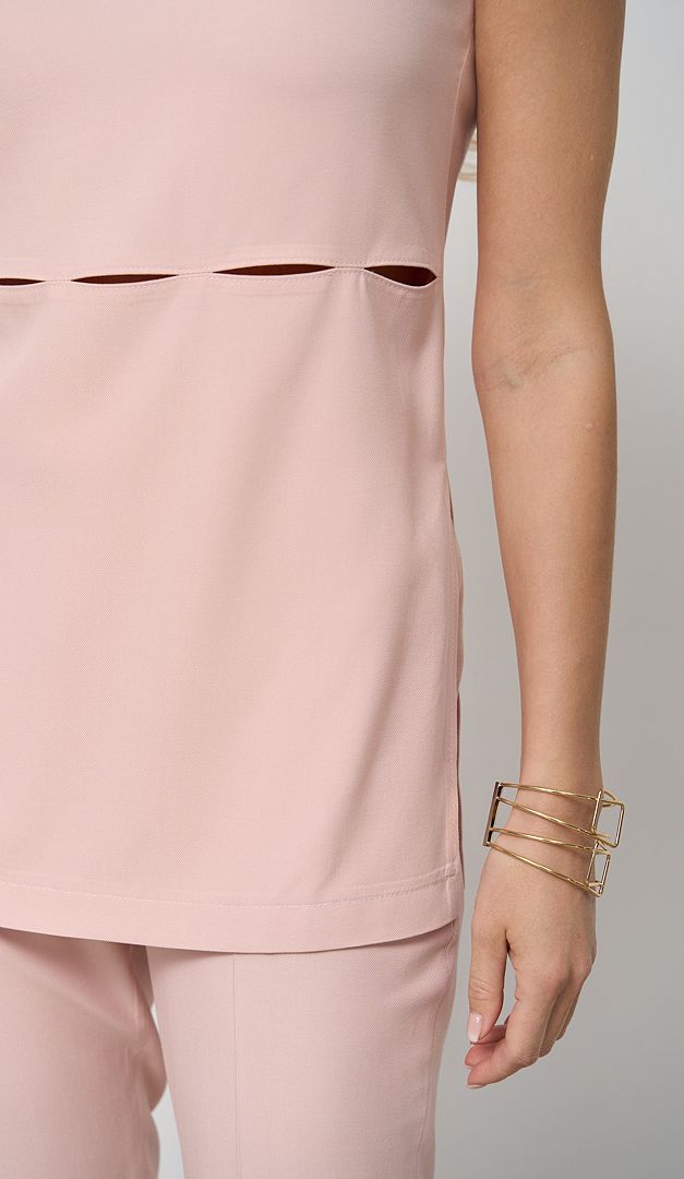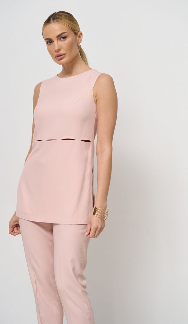 Блузон с разрезами розовый станет удачным решением для оригинальных летних образов. Модель имеет прилегающий крой сверху. свободный низ и аккуратный округлый вырез горловины. Без рукавов и с удобным проемом для рук. Блузон с разрезами розовый выполнен с оригинальной отрезной линией талии, которая спереди оформлена сквозными разрезами, придающими изделию эффектности. Модель застегивается на молнию по центру спинки и имеет высокие распорки по бокам.