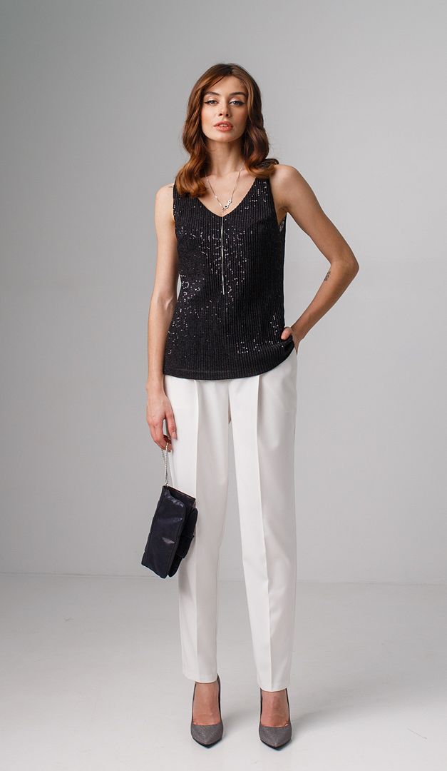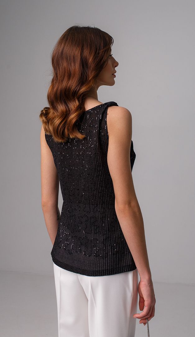Стильный и эффектный черный топ с паетками станет идеальным дополнением к любому Вашему образу. Этот базовый элемент гардероба благодаря своей универсальности и изысканности будет удачно комбинироваться как со сдержанными классическими костюмами, так и с экстравагантными юбками или брюками. Черный топ с пайетками выполнен из легкой, полупрозрачной, фактурной ткани. Модель свободного прямого силуэта с V-образным вырезом. Впереди изделия есть дополнительная тонкая подкладка. Особого шарма модели придают паетки на ткани и стильные декоративные элементы, которыми украшены бретели черного топа.
