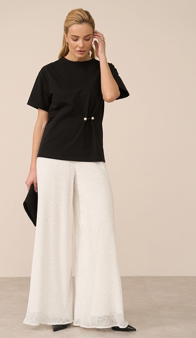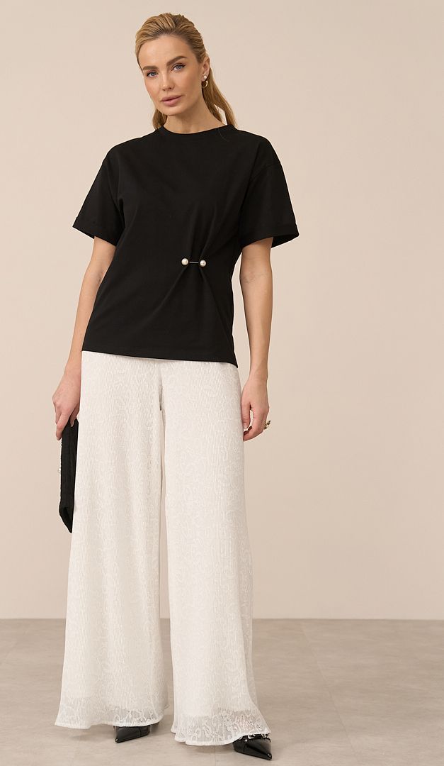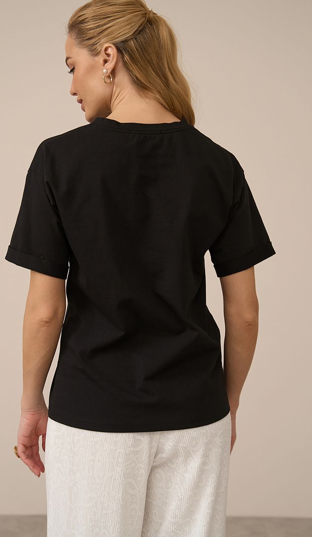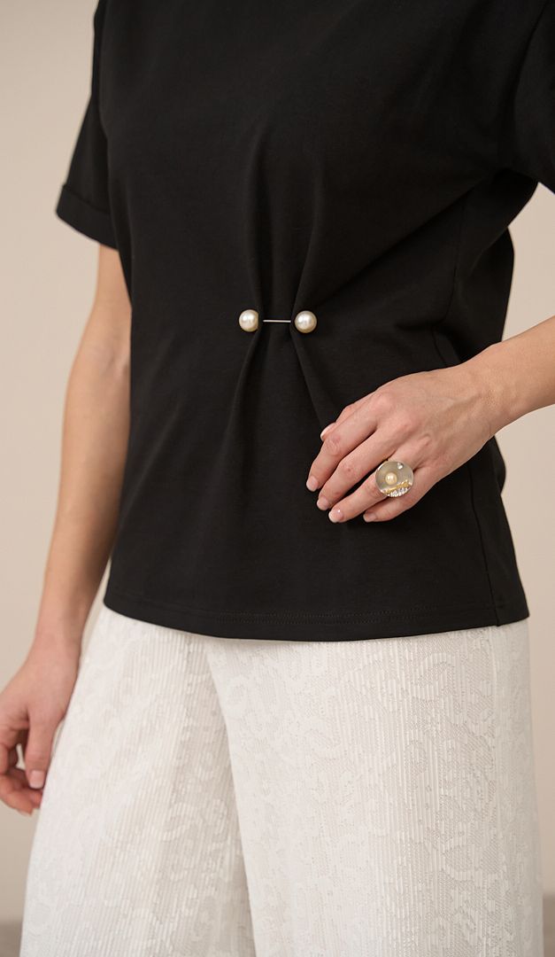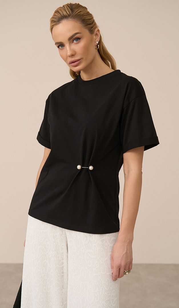 Футболка женская черная с украшением станет базовым элементом как для делового, так и для casual стилей. Модель прямого свободного кроя, с округлым закрытым вырезом горловины.Футболка женская черная с украшением имеет короткий свободный рукав с небольшим отворотом. Съемное украшение с жемчужинами придает изделию оригинальность и лаконичность.
