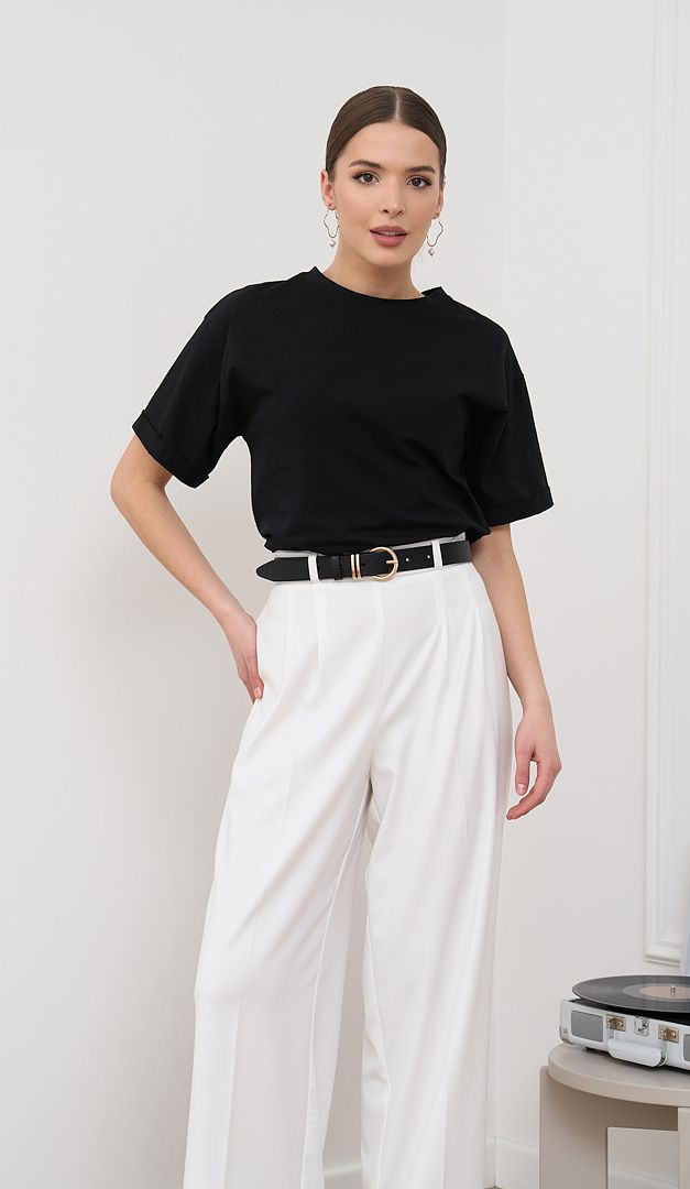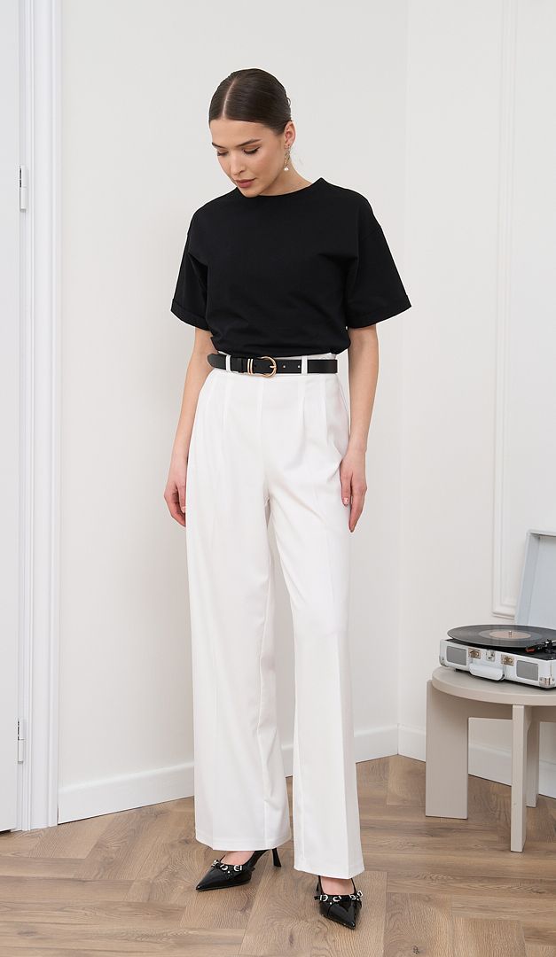 На фото создан образ с брюками гофре молочными (арт.2845) и брюками прямыми молочными (арт.2639).