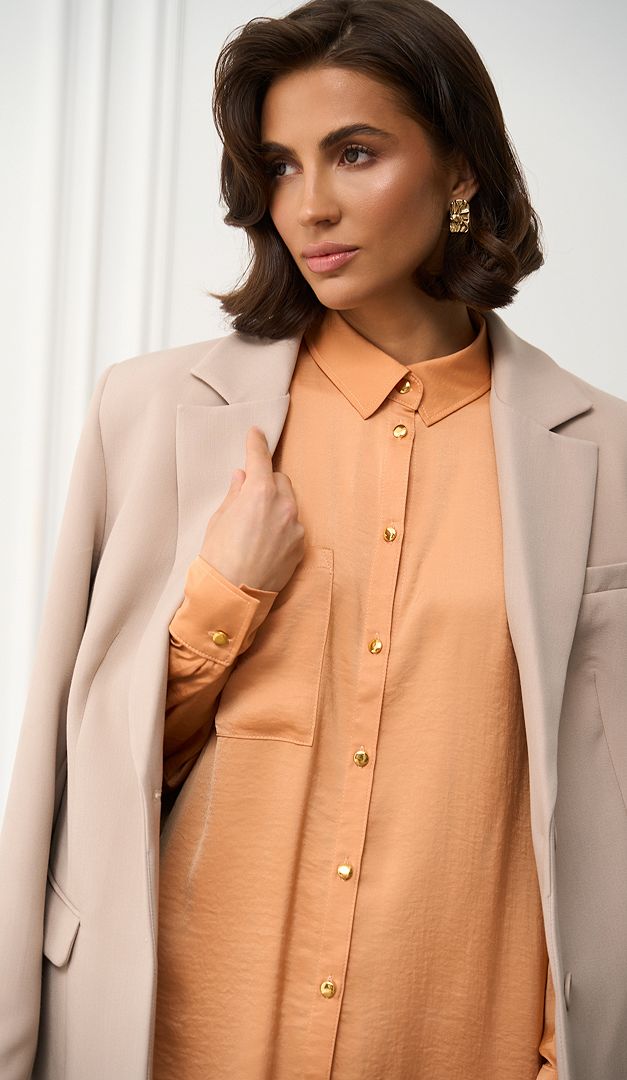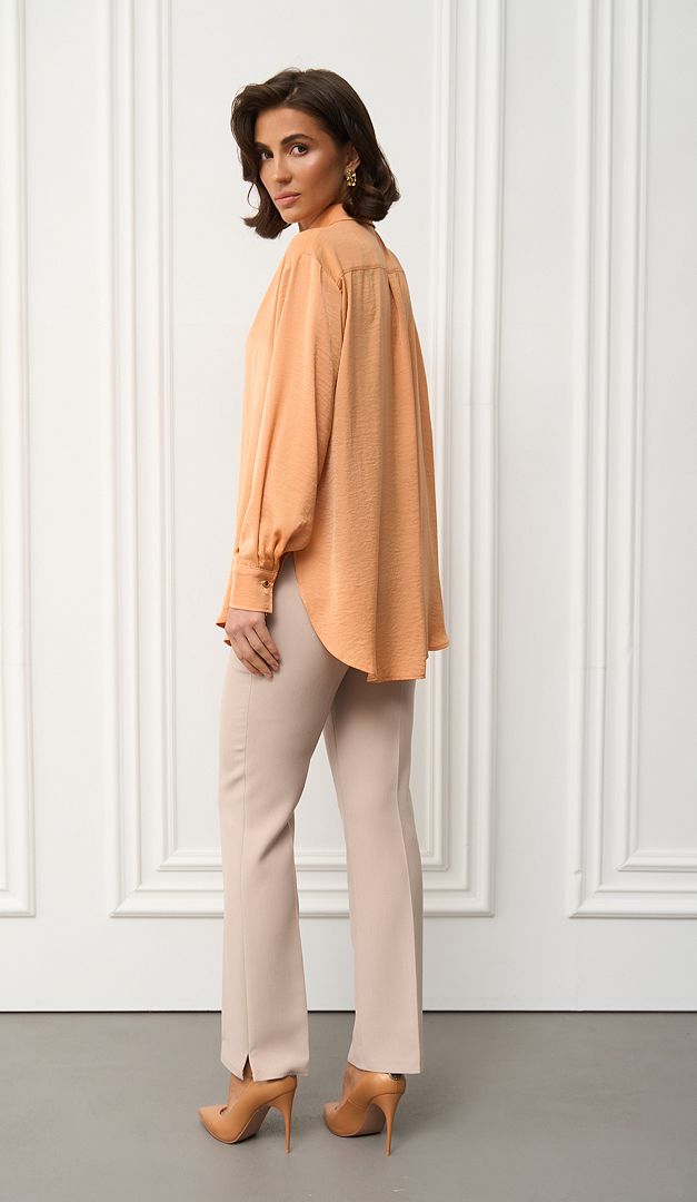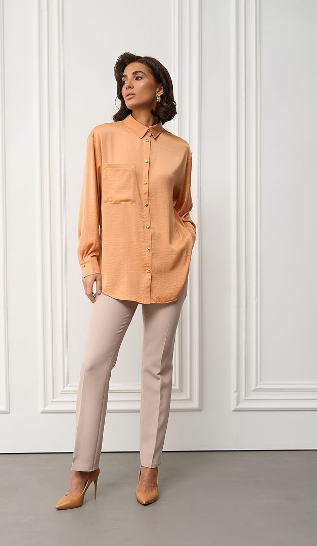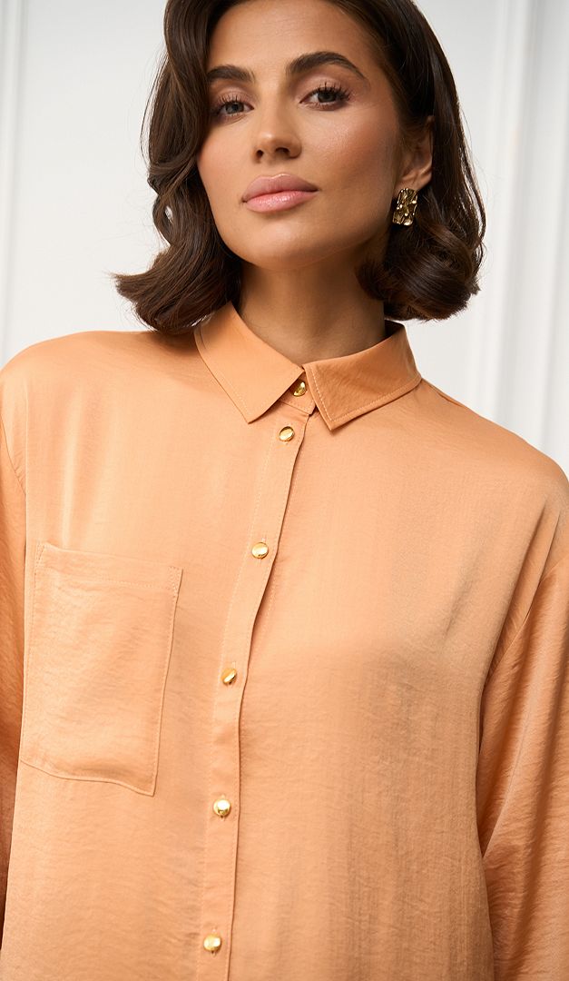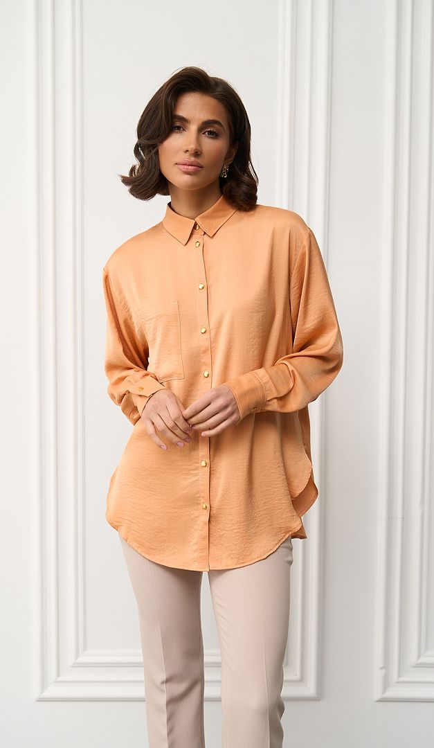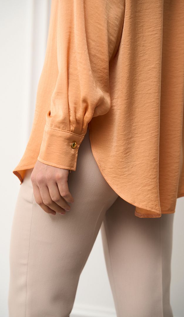 Яркий тренд сезона – рубашка женская оверсайз абрикосовая. Эта базовая вещь поможет создать разнообразные эффектные образы для любого выхода! Рубашка женская оверсайз абрикосовая имеет свободный прямой крой, вырез горловины оформлен классическим отложным воротником на стойке. По центру модели расположена функциональная застежка на пуговицы. Рубашка женская оверсайз абрикосовая выполнена с высокими распорками по боковым швам асимметричного низа. Длинный свободный рукав оформлен манжетой с застежкой на одну пуговицу.