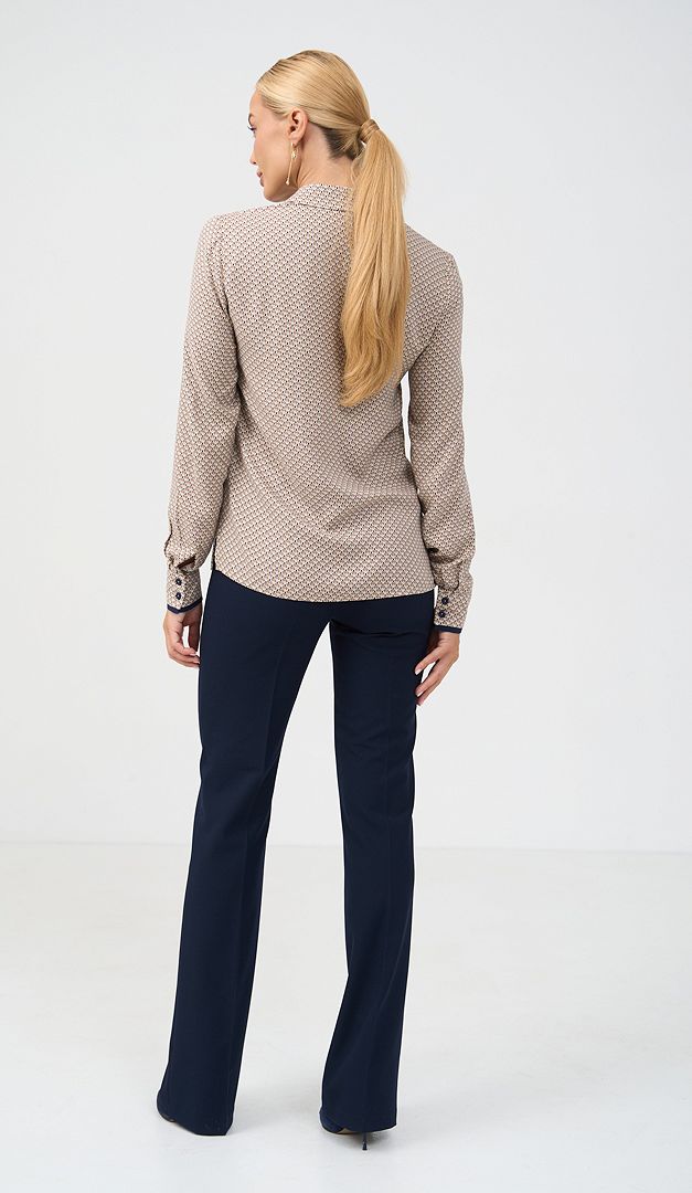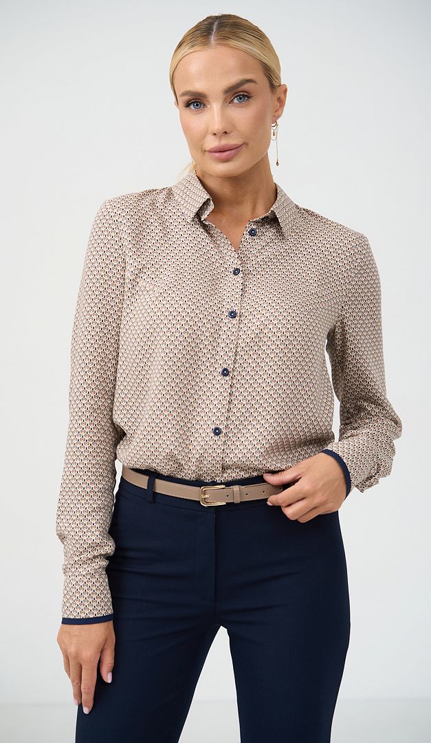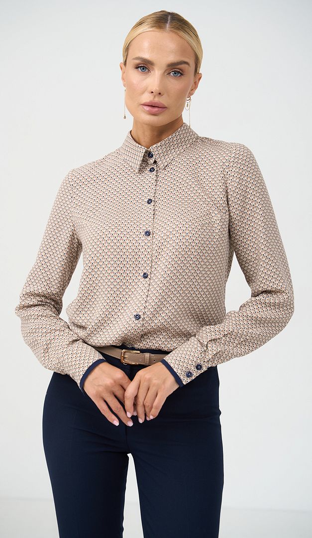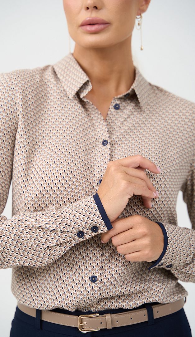 Рубашка женская с принтом беж придаст элегантности и стиля каждому вашему образу. Модель имеет классический дизайн – аккуратный воротник на стойке, планку-застежку на пуговицы, длинный рукав с манжетой по низу. Прямой полуприлегающий крой женской рубашки с принтом беж – это не только удобно, но и очень привлекательно, так как именно в этой модели подчеркивается изящество и грациозность фигуры. По низу боковых швов изделие оформлено невысокими разрезами.