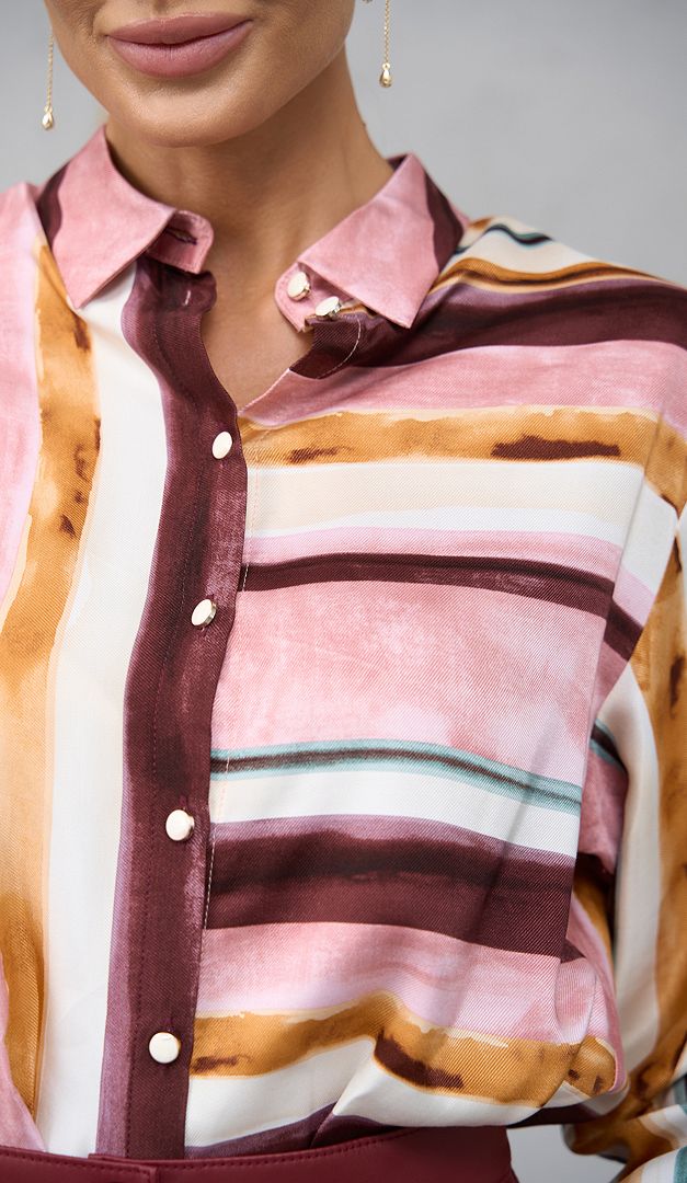Рубашка женская в полоску – оригинальное дополнение к базовому классическому гардеробу. Модель прямого свободного кроя, горловина оформлена отложным воротником-стойкой, переходящим в практическую планку-застежку на пуговицы. Рубашка женская в полоску имеет длинный свободный рукав на манжете и слегка скругленный низ. Благодаря колоритному принту ткани изделие придаст эффектности в любой женский образ.