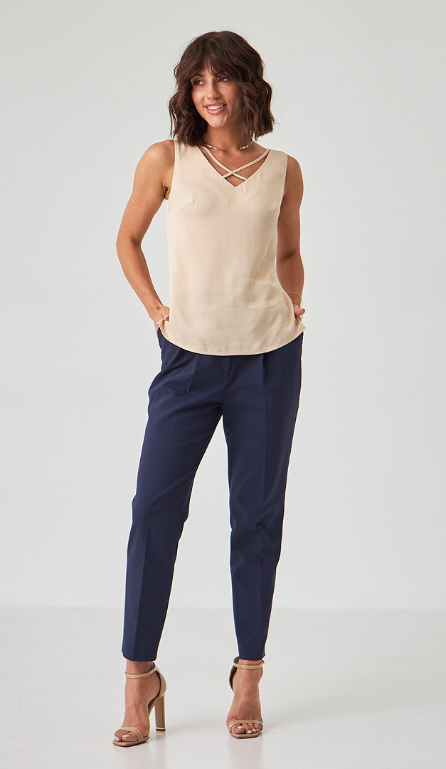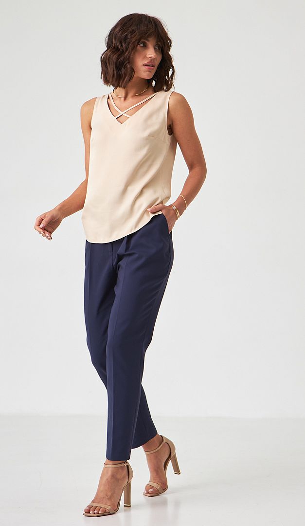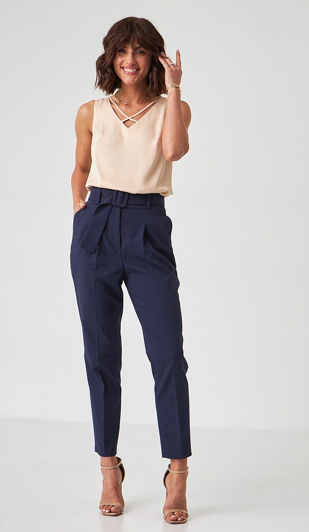 На фото создан лук с брюками с высокой посадкой синими (арт.1795).