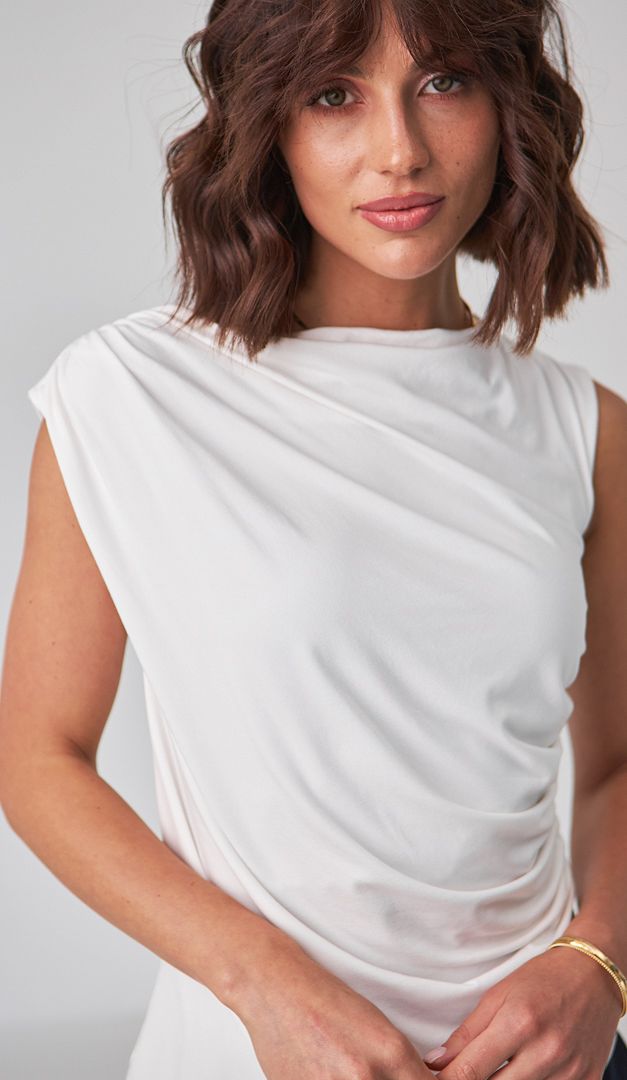 Топ трикотажный с драпировкой молочный невероятно элегантный базовый элемент гардероба, который гармонично дополнит любой классический и повседневный образ. Модель прямого полуприлегающего силуэта с неглубоким округлым вырезом горловины, который оформлен красивой драпировкой, создаваемой благодаря складкам на одном плече. Топ трикотажный с драпировкой молочный имеет слегка округленный низ переда и дополнительное драпирование от центра бокового шва с одной стороны, которое придает ему оригинальности. Модель с подкладкой.