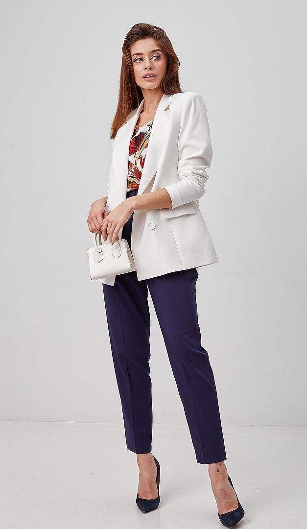 На фото создан образ с базовыми брюками молочными (арт.2440) и брюки с высокой посадкой синими (арт.1795).