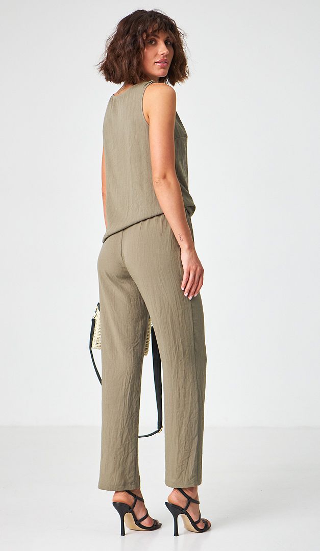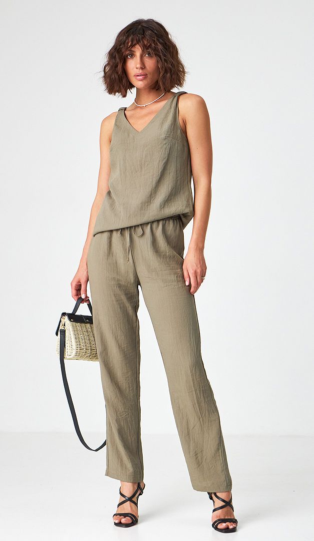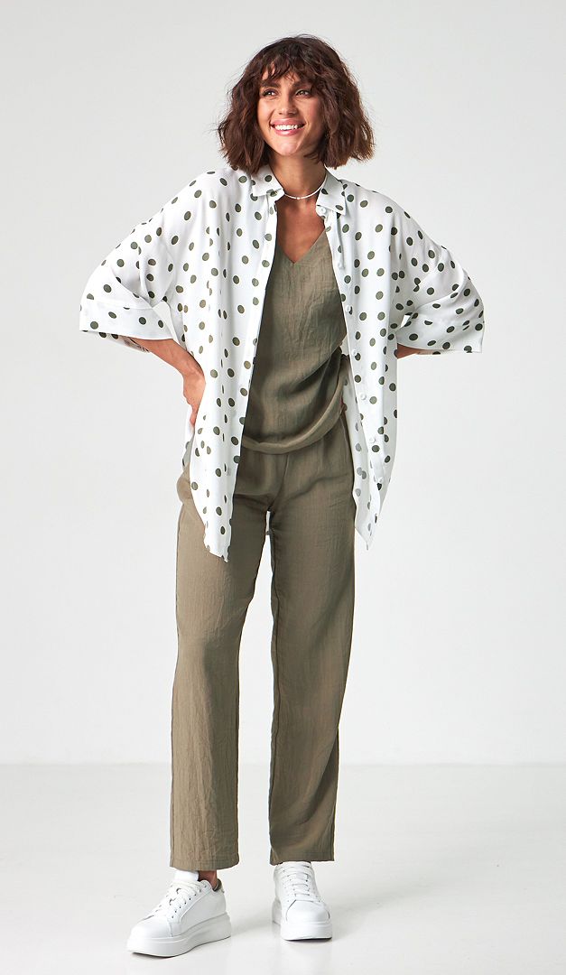 На фото создан образ с женскими брюками на резинке хаки (арт.2366) и рубашкой оверсайз белой в горох (арт.2369)..