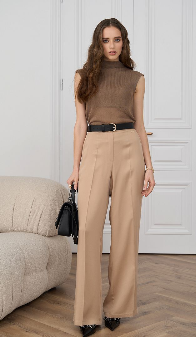На фото создан образ с штанами прямыми карамельными (арт.2657).