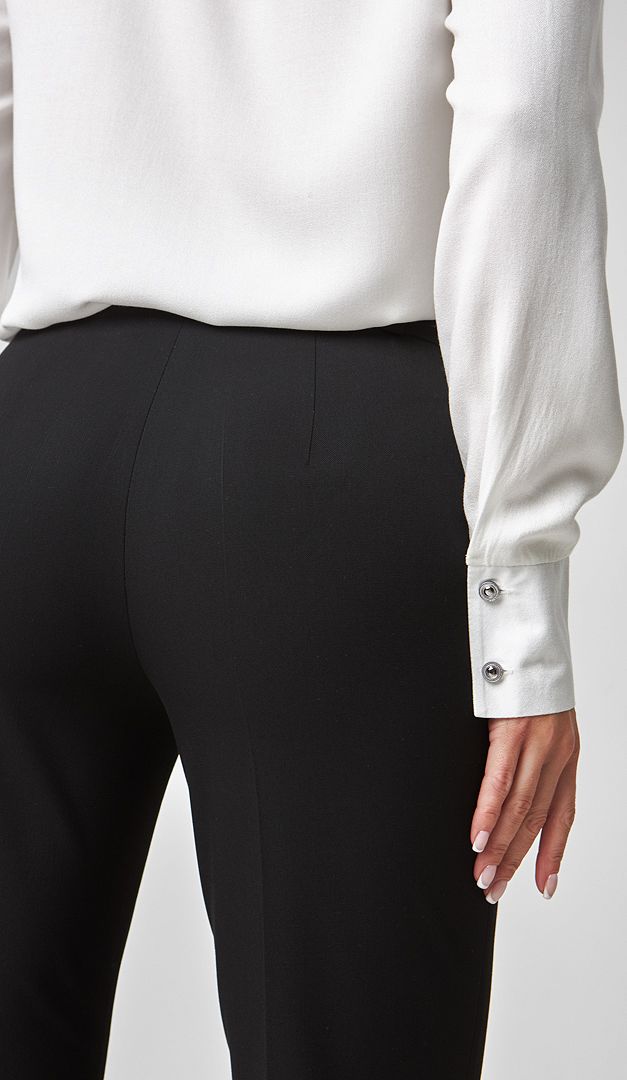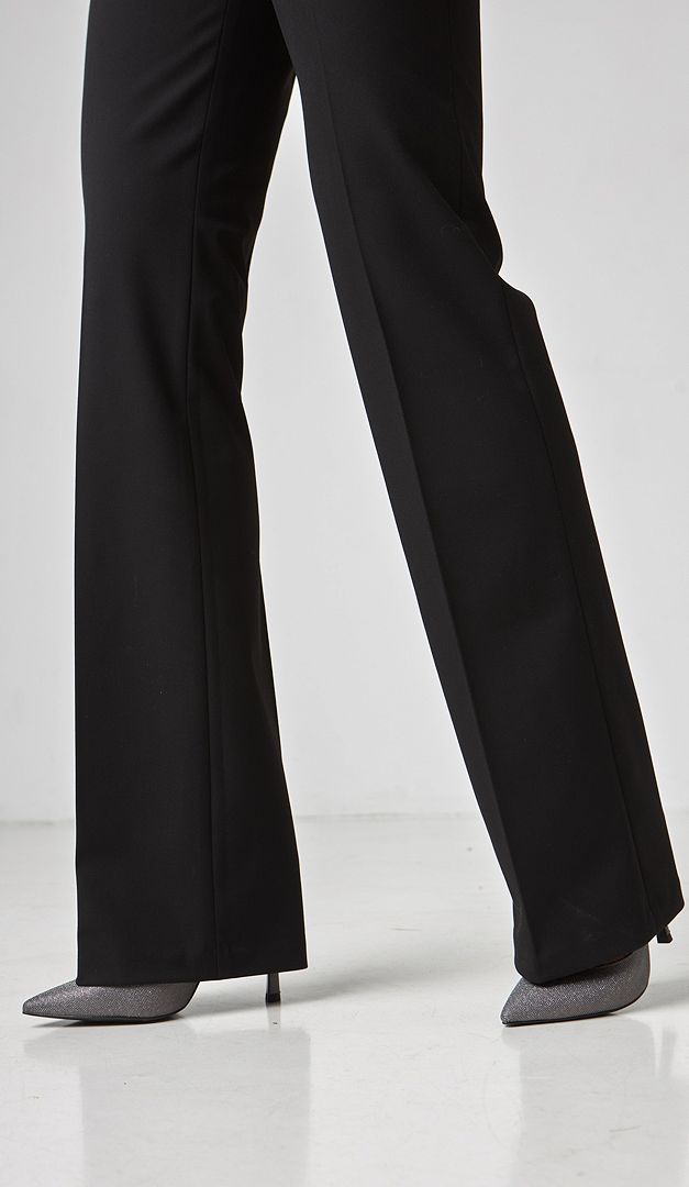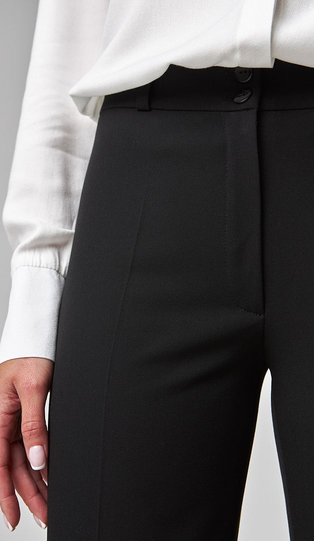 Брюки клеш женские черные – незаменимая база для создания классических деловых образов. Модель со средней посадкой, прямого слегка расклешенного к низу кроя и нешироким поясом с застежкой на две пуговицы и "молнию". Прилегающий верх и элегантно заглаженные стрелки подчеркивают стройность женского силуэта и придают ему привлекательность. Благодаря своей универсальности брюки клеш женские черные можно удачно комбинировать с любой блузкой, гольфом или джемпером из вашего гардероба. Модель без подкладки.