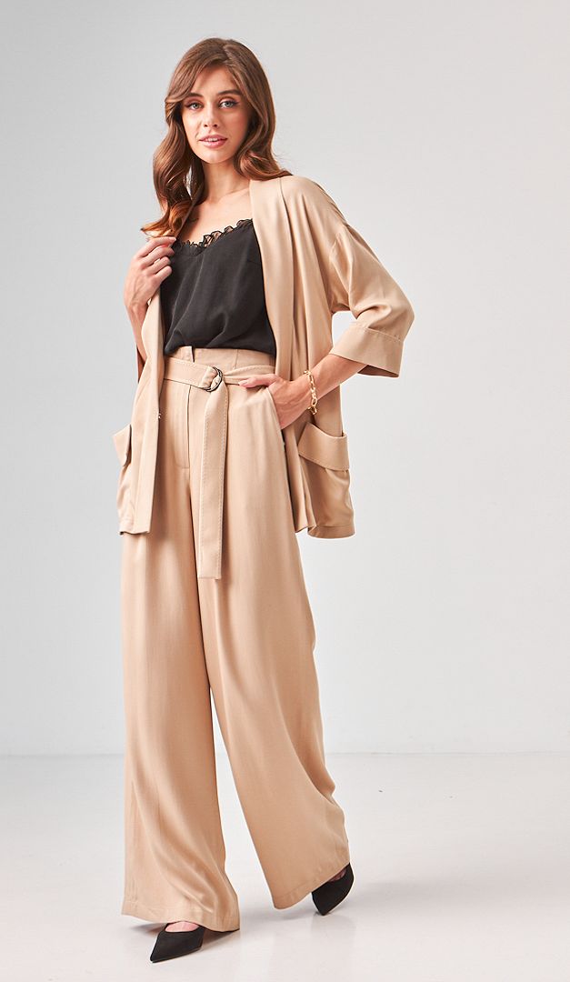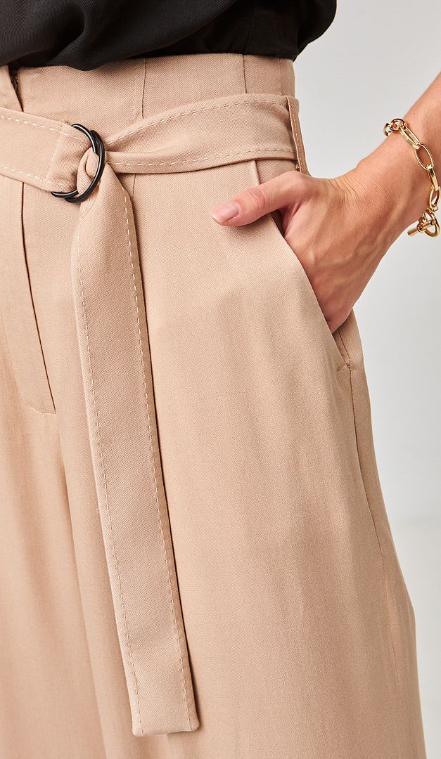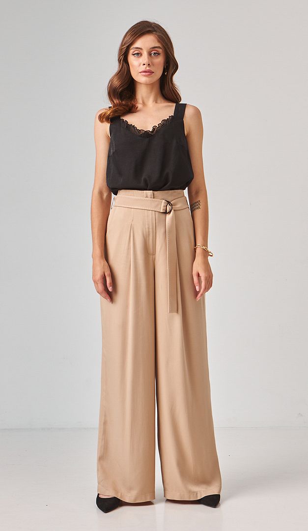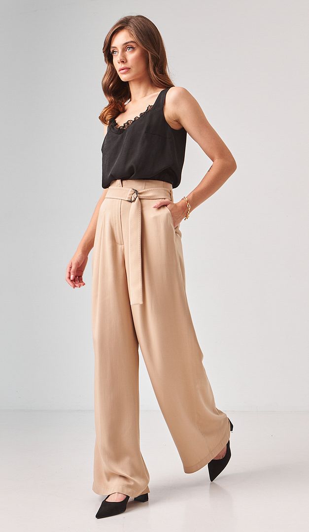 Легкие летние брюки палаццо песочные с поясом идеально подойдут для жарких дней. Модель имеет прямой фасон, высокую посадку на талии, что подчеркивается съемным поясом и застежку на "молнию" и одну потайную пуговицу. Два рабочих кармана по бокам придают изделию практичности. Брюки палаццо песочные с поясом изготовлены из 100% вискозы. Эта ткань невероятно комфортная: легкая, дышащая, слегка тянущаяся и долго служащая. Эта базовая модель блестяще подходит для летнего сезона.