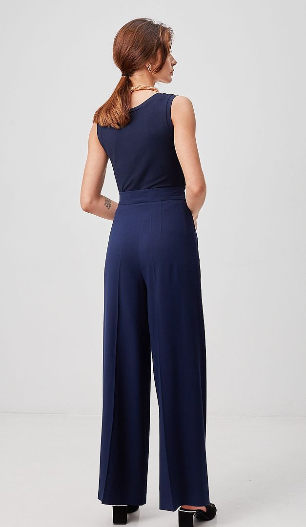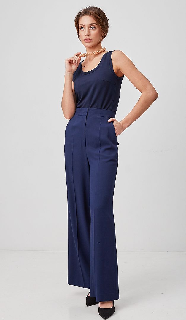 Брюки палаццо синие – идеальный элемент для пополнения базового гардероба. Благодаря своей лаконичности и универсальности к ним подойдет практически любой верх из вашего арсенала. Брюки палаццо синие имеют среднюю посадку по фигуре, прямой свободный крой и два функциональных кармана по бокам. Модель застегивается на удобную «молнию», два крючка и пуговицу. Ткань изделия из 100% вискозы, что обеспечит комфорт в любую погоду.