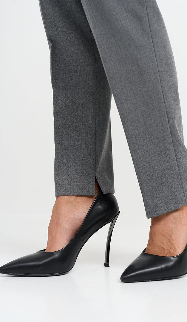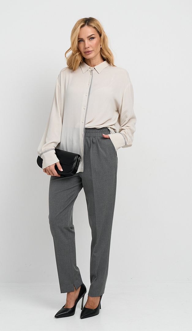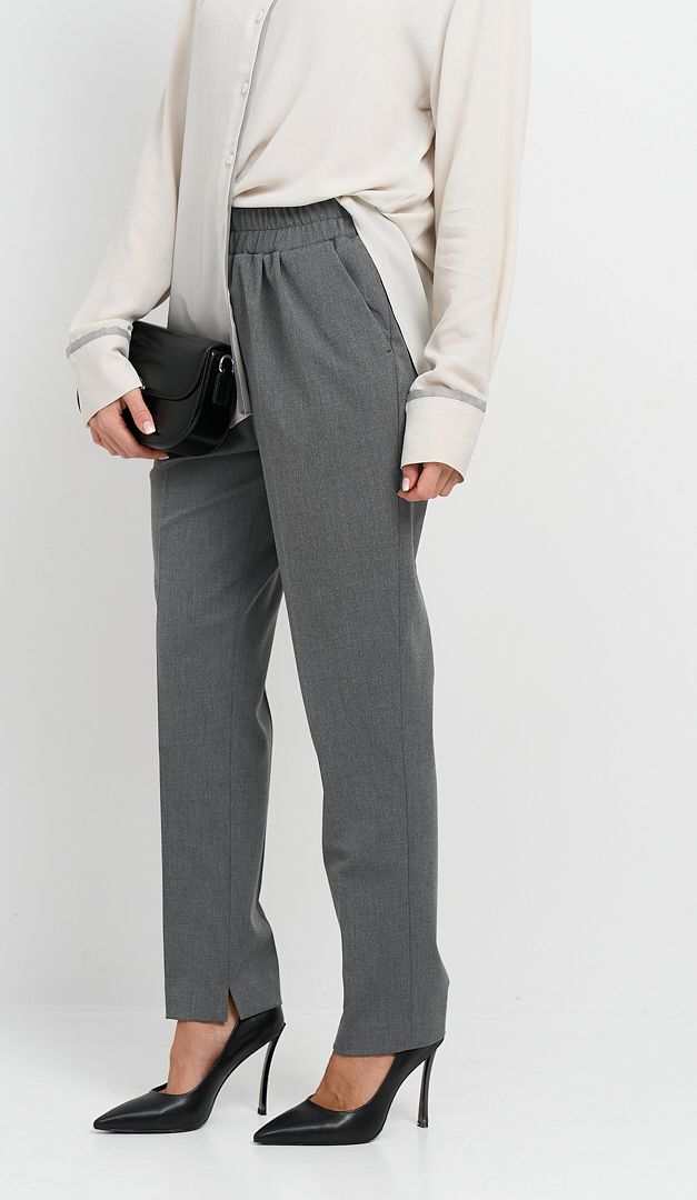 Стильные и практичные брюки женские на резинке серые станут базовым элементом для создания повседневных аутфитов в вашем гардеробе. Модель сверху оформлена широкой резинкой, идеально фиксирующей изделие на талии. Брюки женские на резинке серые имеют среднюю посадку по фигуре и суженный к низу крой. По бокам модель дополнена прорезными карманами, а ее низ по внутреннему шву имеет небольшой разрез. Благодаря своей универсальности брюки женские на резинке серые удачно подойдут как для базового офисного дресс-кода, так и для луков в стиле casual. Без застежек и подкладки.