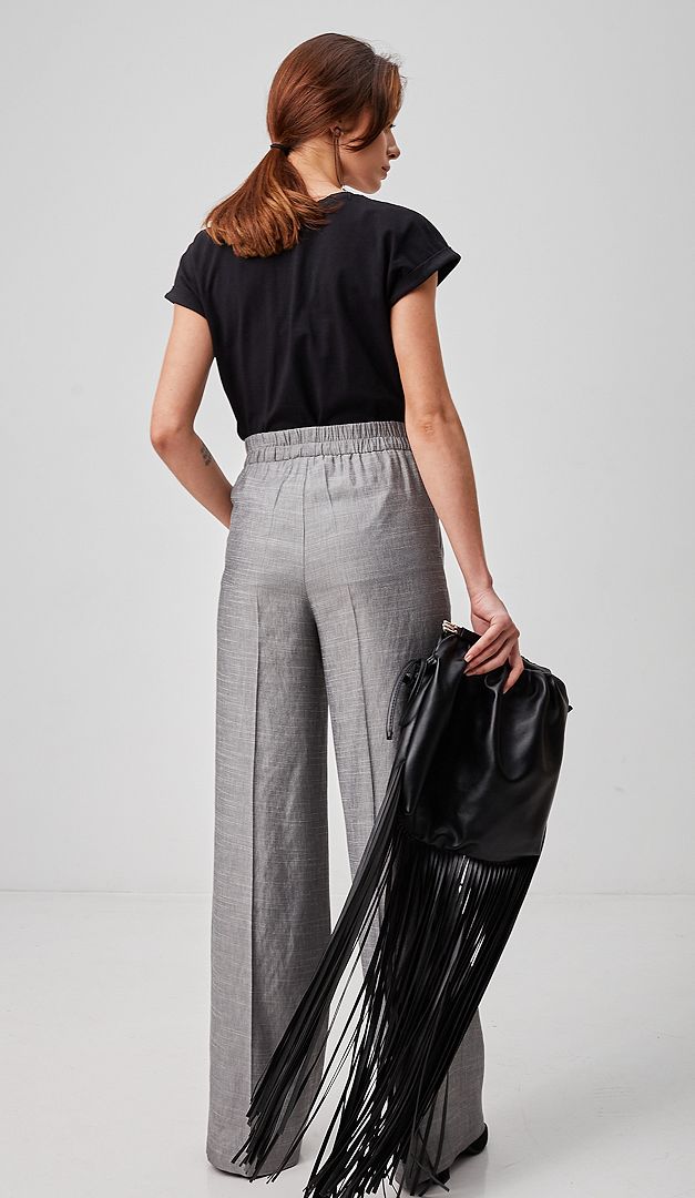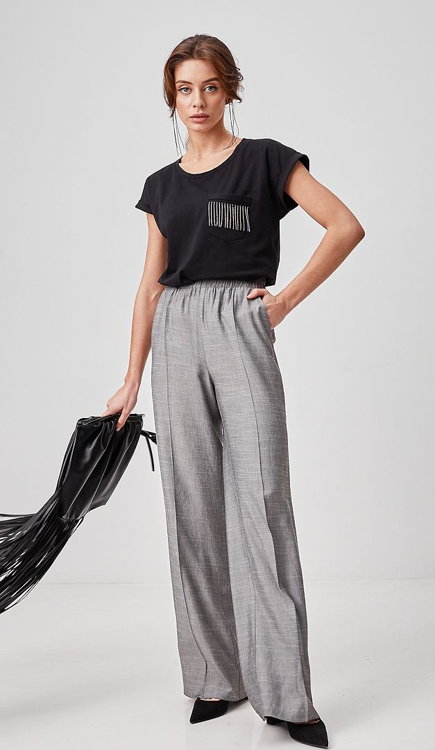 Легкость, удобство и элегантность – это все о широких серых брюках на резинке, которые станут идеальным решением для предстоящего летнего сезона. Модель имеет среднюю посадку по фигуре и прямой свободный крой. Верх оформлен широкой резинкой, без дополнительных застежек. По бокам широкие серые брюки на резинке имеют функциональные карманы. Благодаря своей лаконичности изделие станет универсальной базой для любых летних образов.