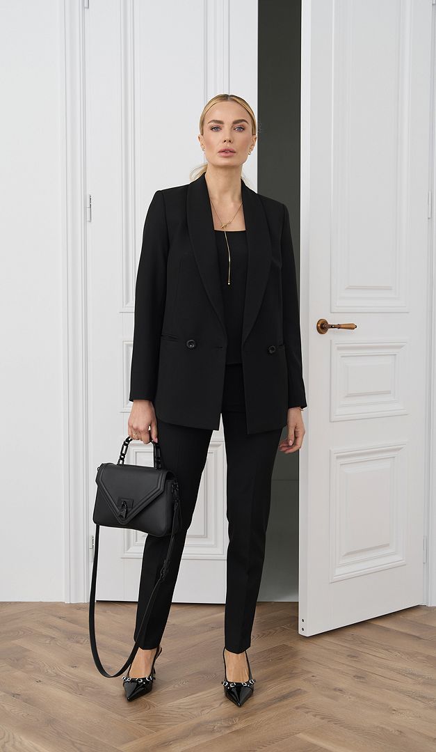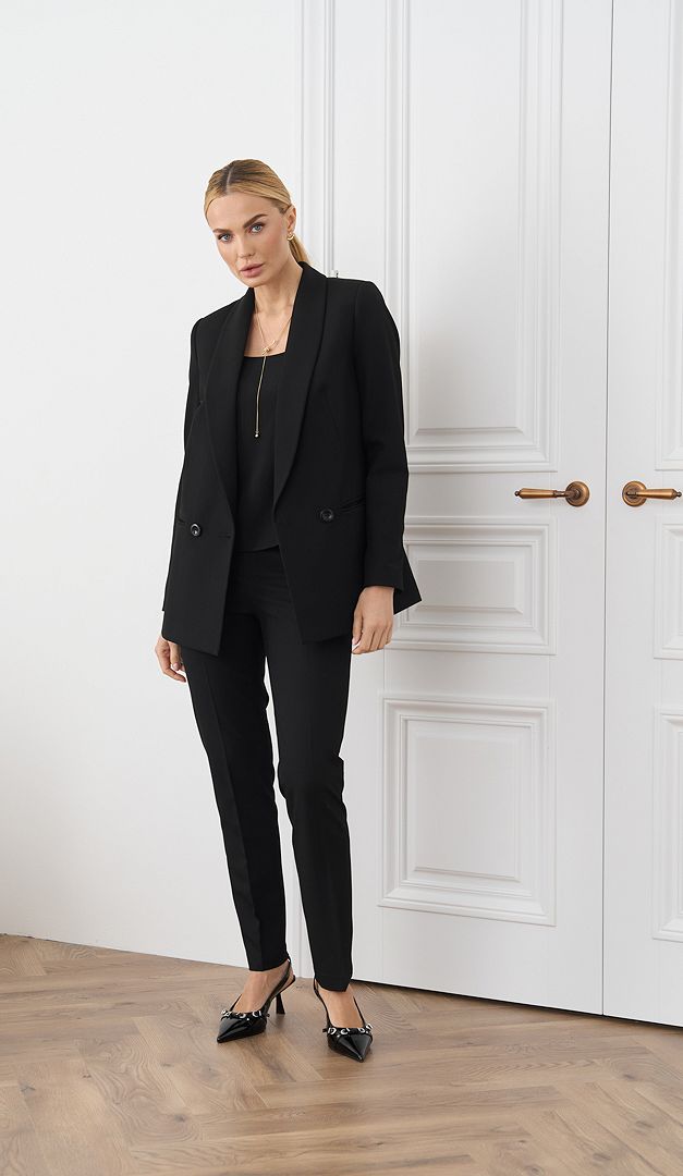 На фото создан лук с топом на тонких бретельках черным (арт.2423) и жакетом базовым двухбортным черным (арт.2689).
