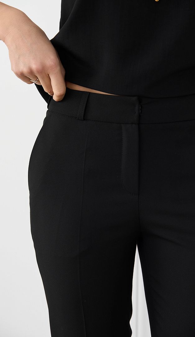 Штаны женские базовые чёрные – это именно та незаменимая база, которая обязательно должна быть в каждом женском гардеробе! Модель полуприлегающего кроя, со средней посадкой по фигуре и пришивным поясом с застежкой на "молнию", крючок и одну потайную пуговицу. Штаны женские базовые чёрные дополнены функциональными боковыми карманами и неглубокими распорками по низу боковых швов. Заглаженные стрелки придают женскому силуэту стройность, а универсальный цвет практичности. Модель без подкладки.