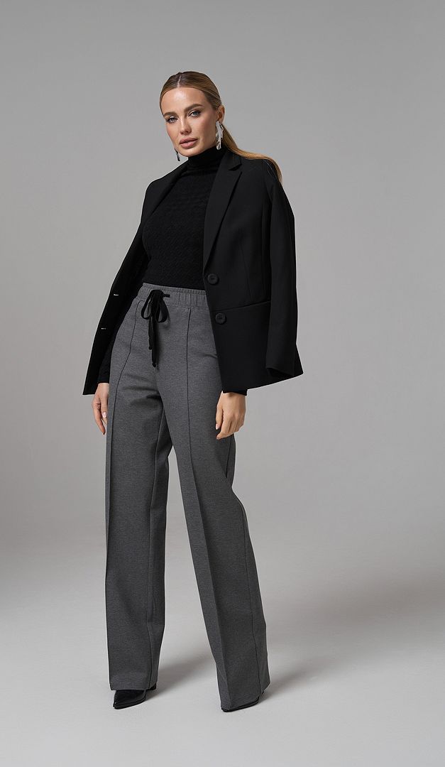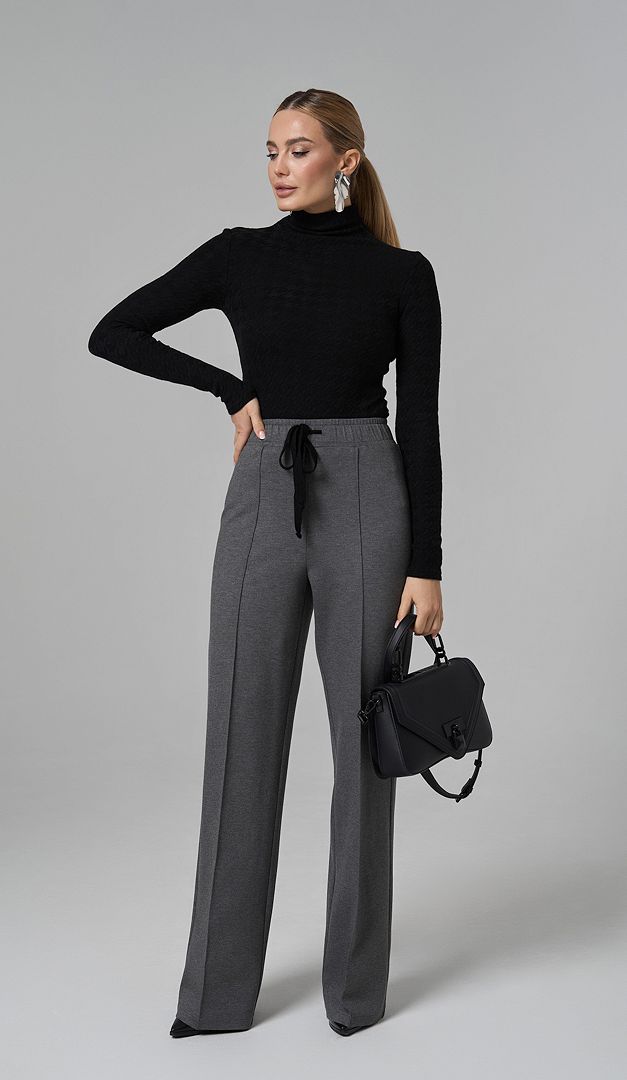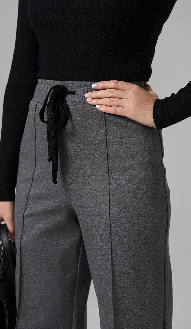 Штаны женские прямые серые – базовая вещь для создания комфортных стильных образов. Модель свободного прямого кроя, верх оформлен широким поясом с эластичной резинкой и вшитой шнуровкой для удобства. Штаны женские серые прямые выполнены из плотной трикотажной ткани и имеют просроченные стрелки по центру, которые держат форму и придают силуэту стройности. Без застежек и карманов.
