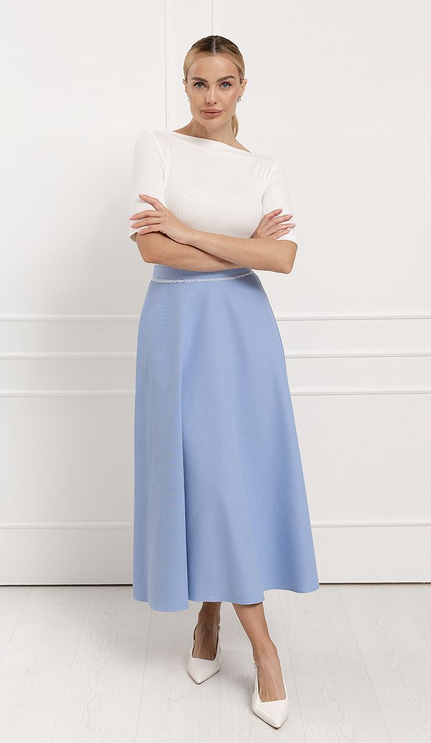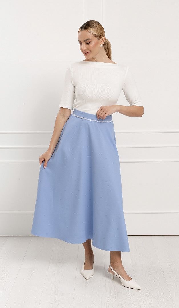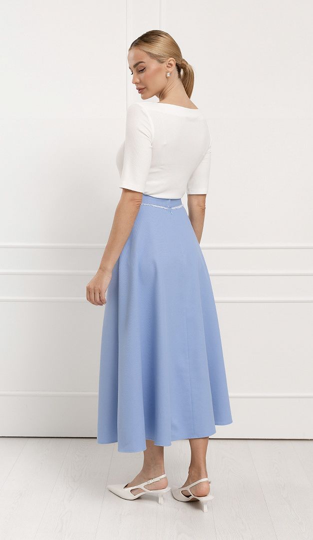 Юбка джинсовая голубая – трендовая вещь для базового женского гардероба. Модель свободного, расклешенного к низу кроя и элегантной длиной миди. Юбка джинсовая голубая сверху оформлена классическим поясом, который стильно подчеркивается короткой белой бахромой. Изделие имеет удобную среднюю посадку по фигуре и застежку на один крючок и молнию, расположенные сзади по центральному шву. Благодаря своему универсальному лаконичному дизайну, юбка будет удачно комбинироваться как в офисных луках, так и в аутфитах в casual стиле. Без подкладки.
