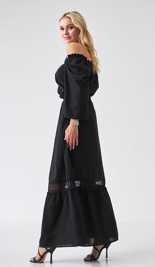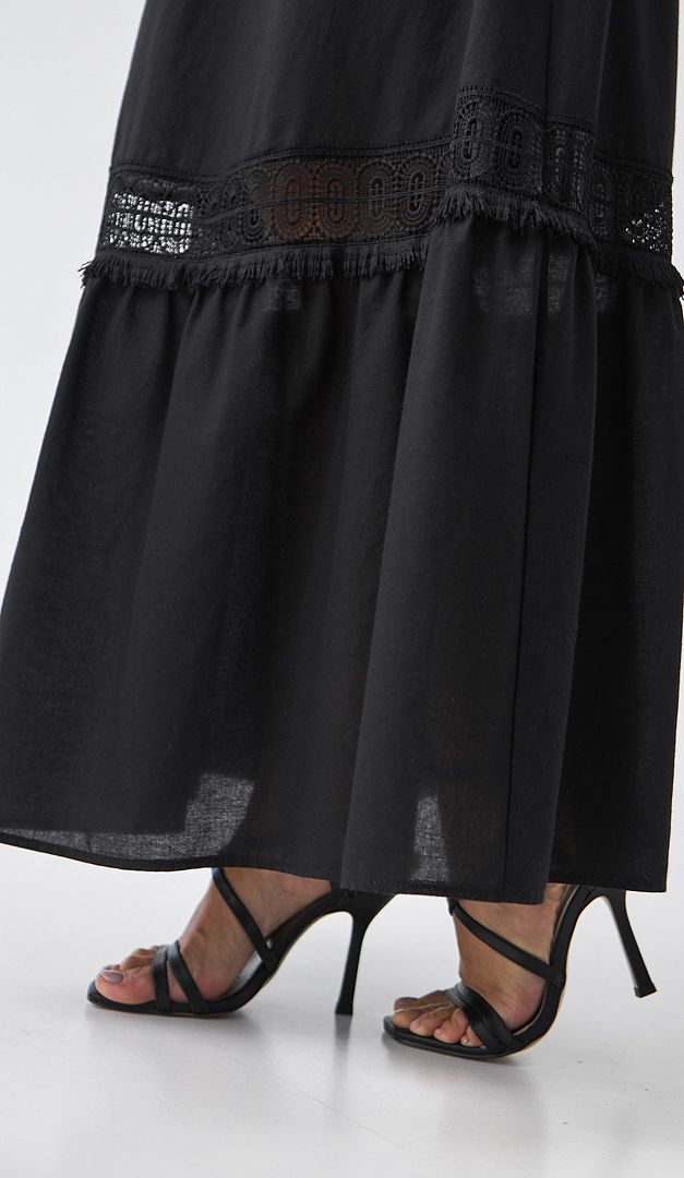 Юбка макси черная — must have нового сезона. Модель свободного, слегка расклешенного книзу кроя. Верх юбки макси черной оформлен широкой эластичной резинкой, что придает ей практичность. Благодаря универсальному цвету изделие будет удачно комбинироваться с любым верхом, а натуральная ткань из 100% хлопка обеспечит телу комфорт. Оригинальности модели добавляет вставка из красивого кружева. Юбка без застежек и без подкладки.