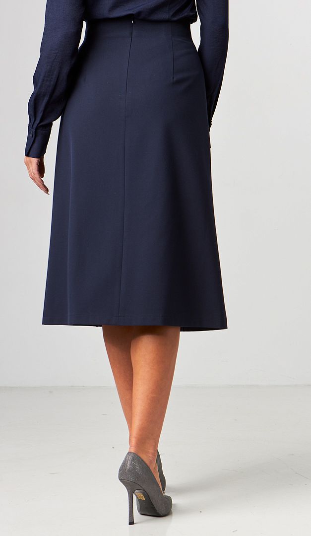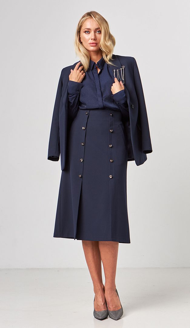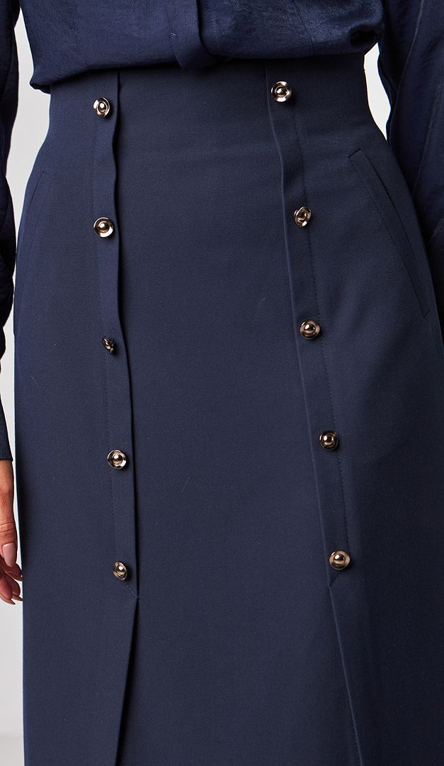 Юбка трапеция с пуговицами – оригинальное дополнение к вашему базовому классическому гардеробу. Модель имеет удобный и практичный крой со средней посадкой на талии. Эффективности изделию добавляют две стилизованные планки, украшенные пуговицами спереди, которые переходят в высокие распорки. Юбка трапеция с пуговицами имеет функциональные карманы по бокам, обеспечивающие дополнительный комфорт. Изнутри модель оформлена подкладкой и застегивается на молнию, расположенную в среднем шве, сзади.