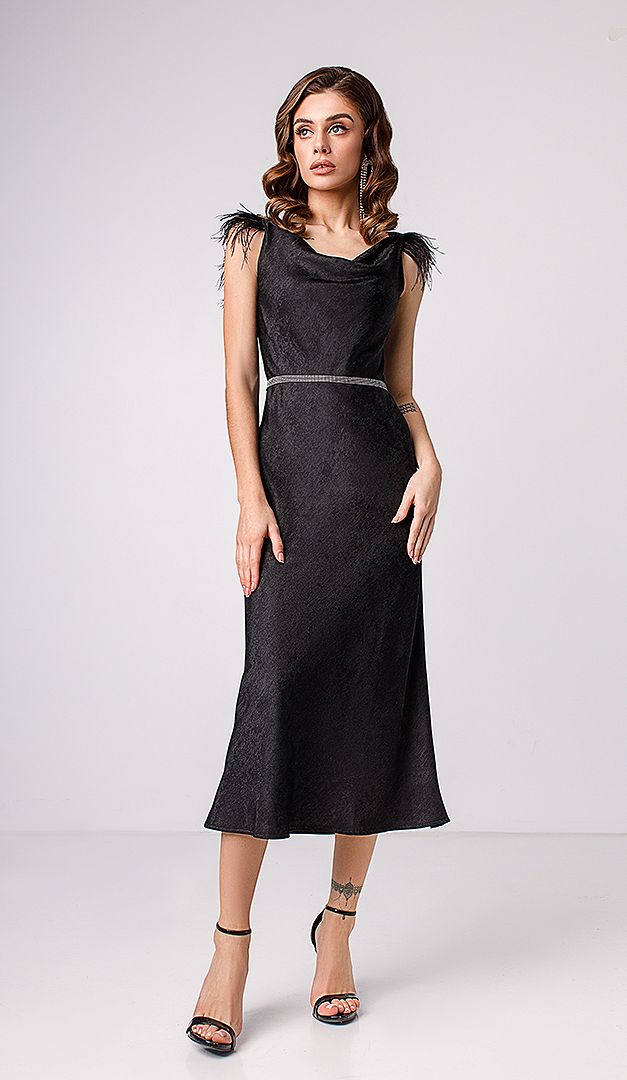 Сдержанность, лаконичность и эффектные акценты – это все о черном платье с перьями. Модель изготовлена из приятной шелковистой ткани, имеет прямой мягко спадающий крой и элегантную длину "макси". Горловина платья оформлена оригинальным драпированным вырезом. Особой экстравагантности изделию добавляют красивые длинные перья, которыми оформлены широкие бретельки черного платья. Перья крепятся к бретелям с помощью функциональных потайных кнопок, благодаря чему, их можно при желании отстегнуть. Изделие без застежек и подкладки.