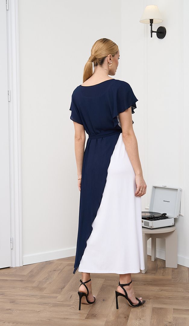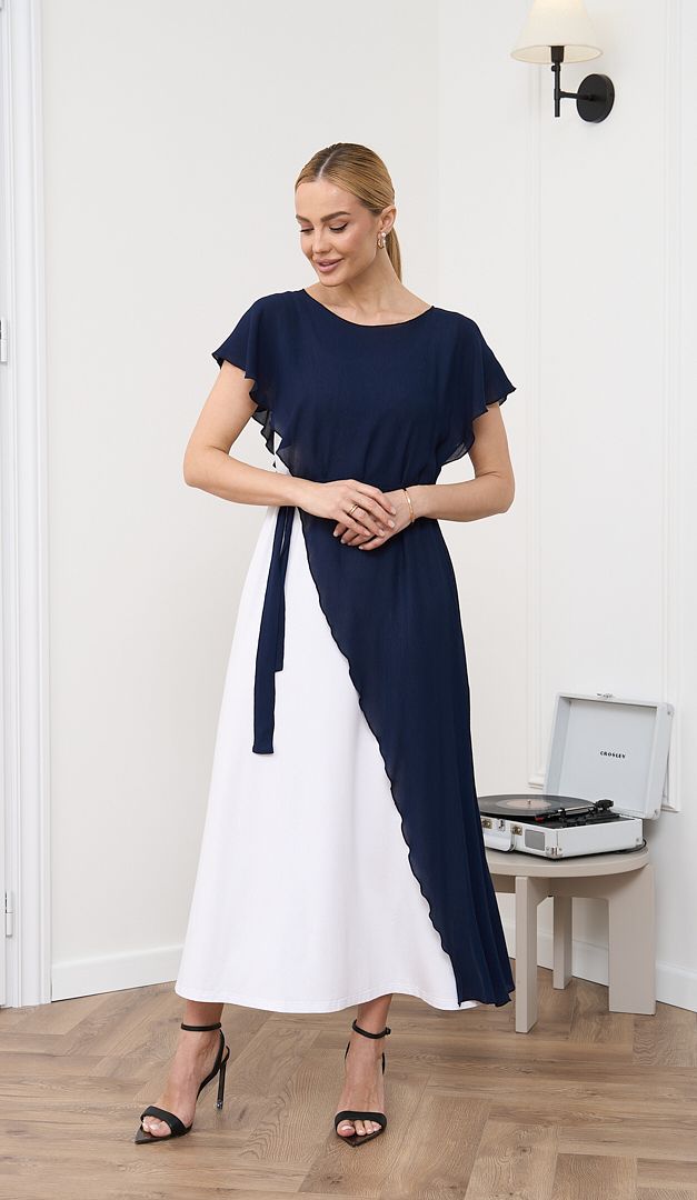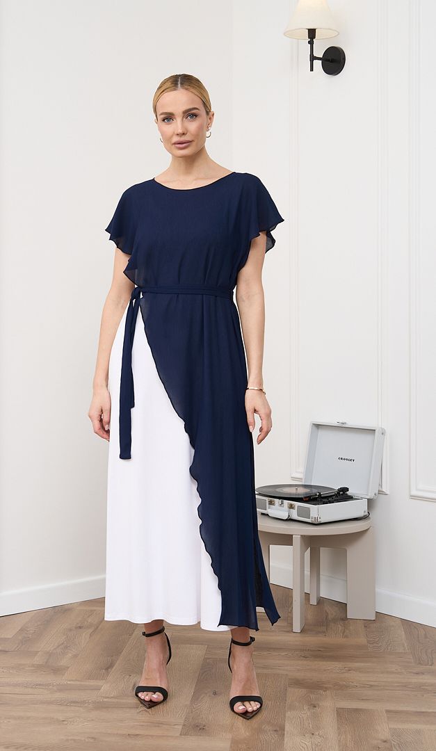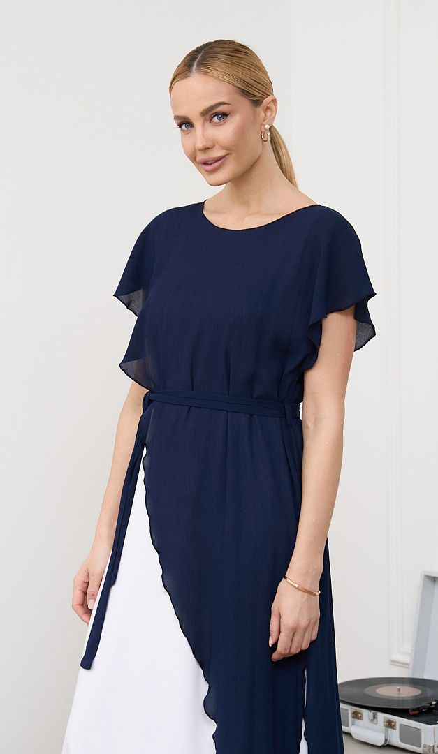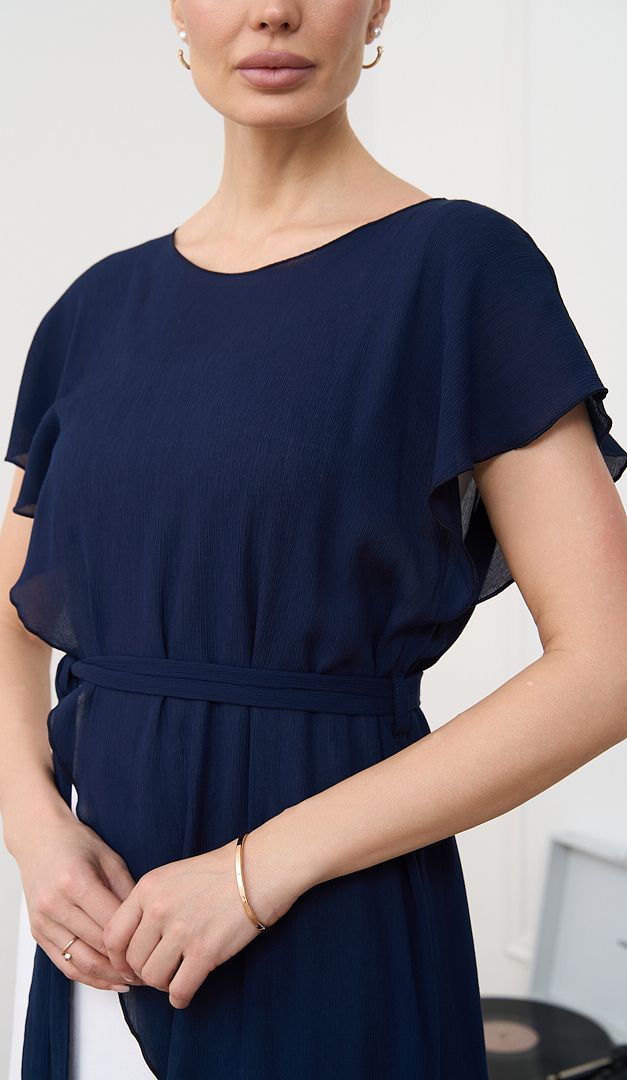 Платье летнее комбинированное сине-белое придаст эффектности и подчеркнет женственность. Модель выполнена из двух самостоятельных изделий: белого платья из натуральной ткани – вискоза 100% и асимметричной темно-синей накидки. Платье прямого полувольного кроя, с широкими бретельками и округлым вырезом горловины. Накидка имеет свободный асимметричный крой, неглубокий округлый вырез горловины и на линии талии дополнена функциональным поясом. Контраст цвета и комбинация различных фактур ткани создают невероятно стильный образ.
