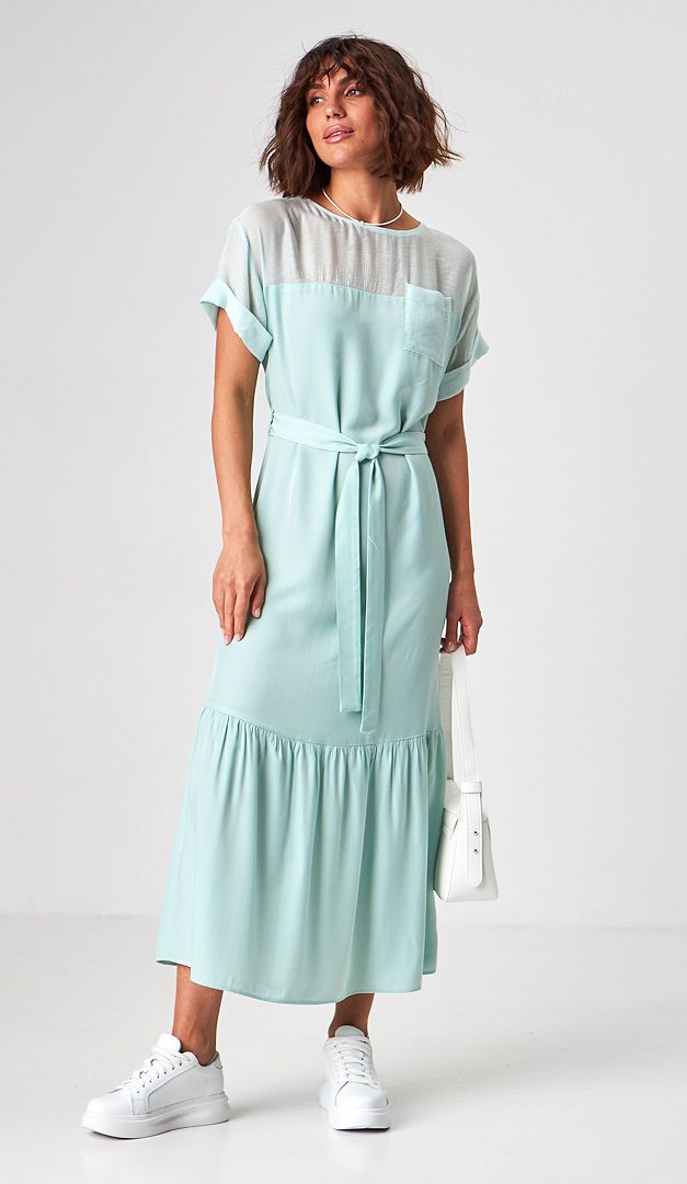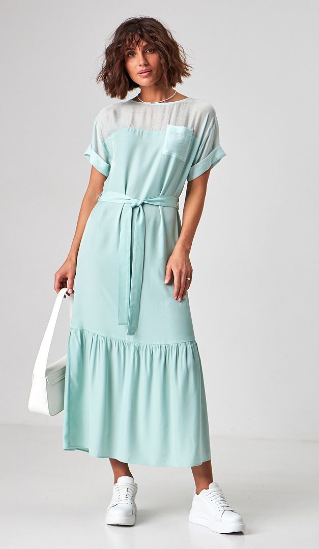Платье макси мятного цвета создано специально для вас разного и уникального. Ее ведь можно носить как с трендовыми кедами, так и с любимыми босоножками. Модель прямого кроя, с неглубоким вырезом горловины и коротким рукавом, оформленным по краю отворотом. На линии талии, платье макси мятного цвета дополнено поясом, подчеркивающим изящество женского силуэта. А стильный волан по низу, придает образу романтических ноток. Оригинальность изделия придает сочетание двух разнофактурных тканей. Модель без подкладки и застежек.