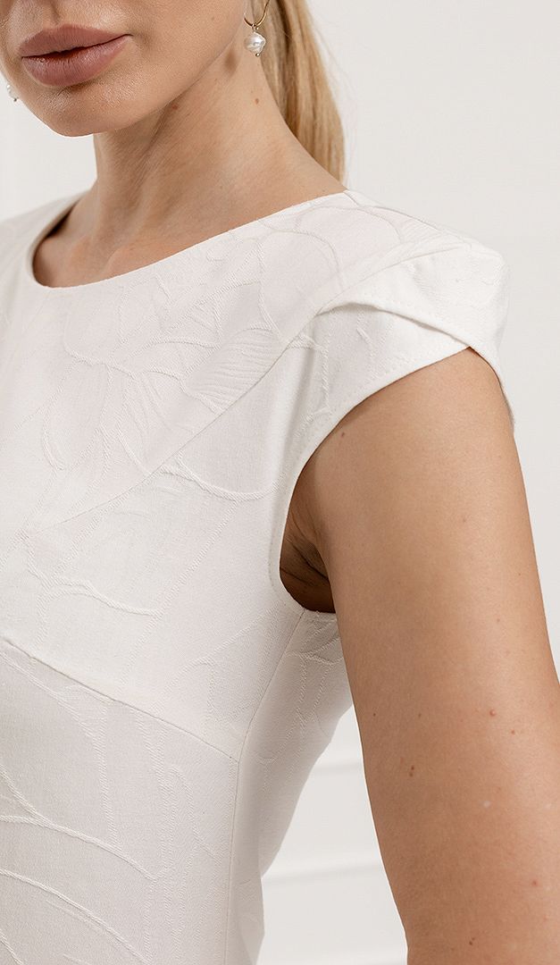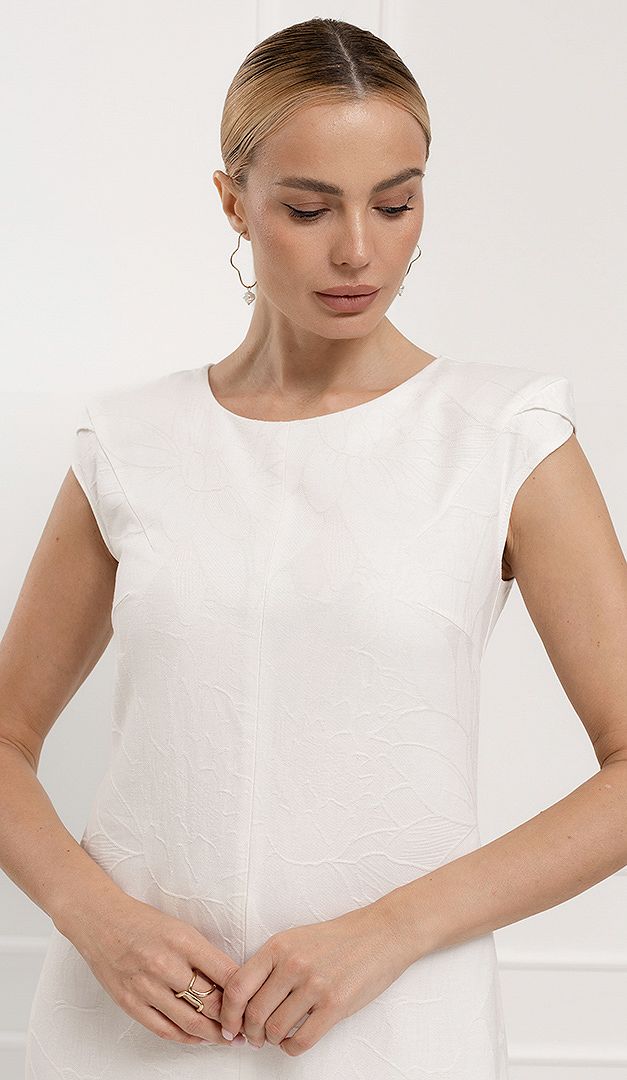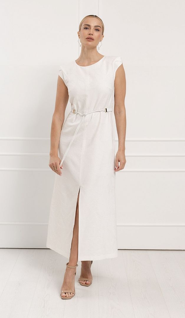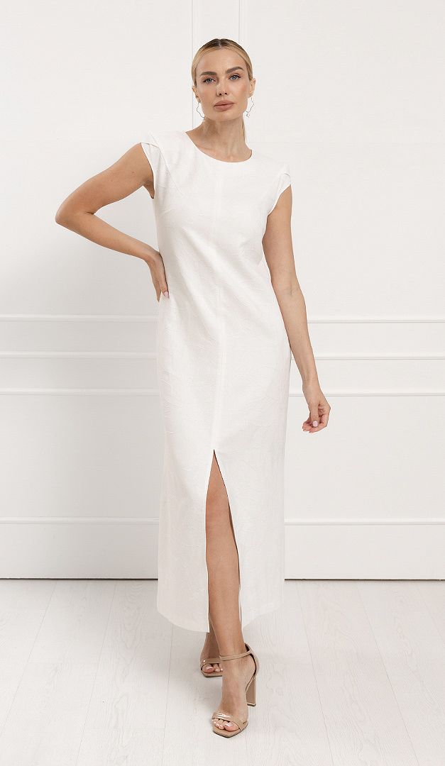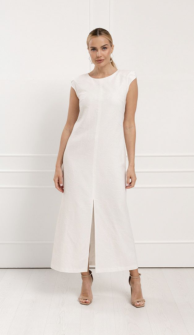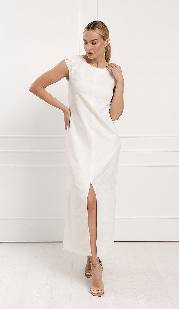 Платье макси с разрезом молочное – универсальная базовая вещь для летнего гардероба. Модель имеет легкую трапецию, которая делает женскую фигуру более утонченной, с неглубоким вырезом горловины и трендовой длиной макси. Платье макси с разрезом молочное застегивается на потайную молнию, расположенную в центральном заднем шве. Для создания более изящного силуэта изделие дополнено тонкими плечевыми накладками, а высокий разрез по центру переда подчеркивает женственность созданного образа. Без подкладки.