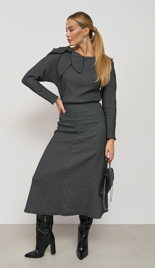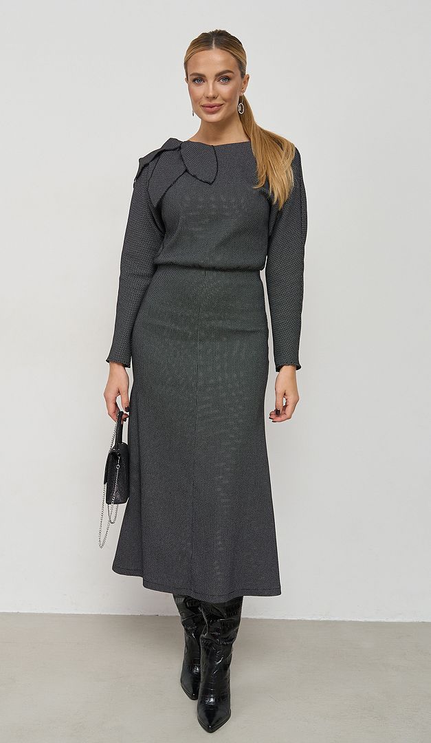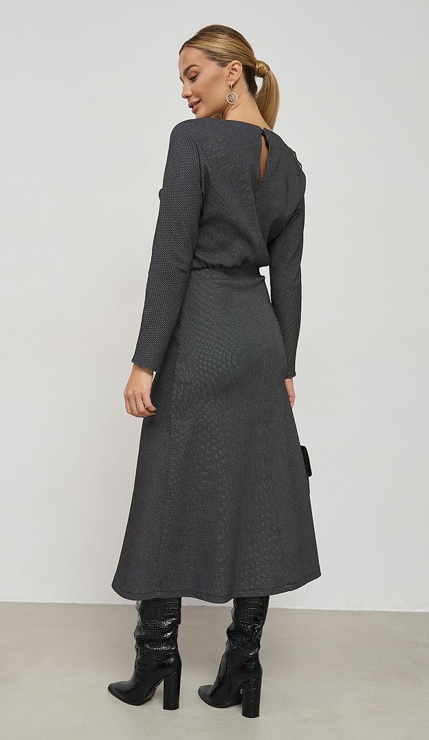 Платье миди черный меланж – вещь, которая подчеркнет женственность и утонченность созданного образа. Модель имеет облегающий верх и расширенную книз юбку длиной миди, что создает невероятно привлекательный А-силуэт. Платье миди черный меланж оформлено неглубоким округлым вырезом горловины, который сзади застегивается на одну пуговицу, а спереди украшен оригинальным декоративным элементом из аналогичной ткани, который при желании можно снять. Отрезная линия талии для большей практичности дополнена эластичной резинкой, а длинный цельно кроенный рукав имеет слегка зауженную книзу форму.