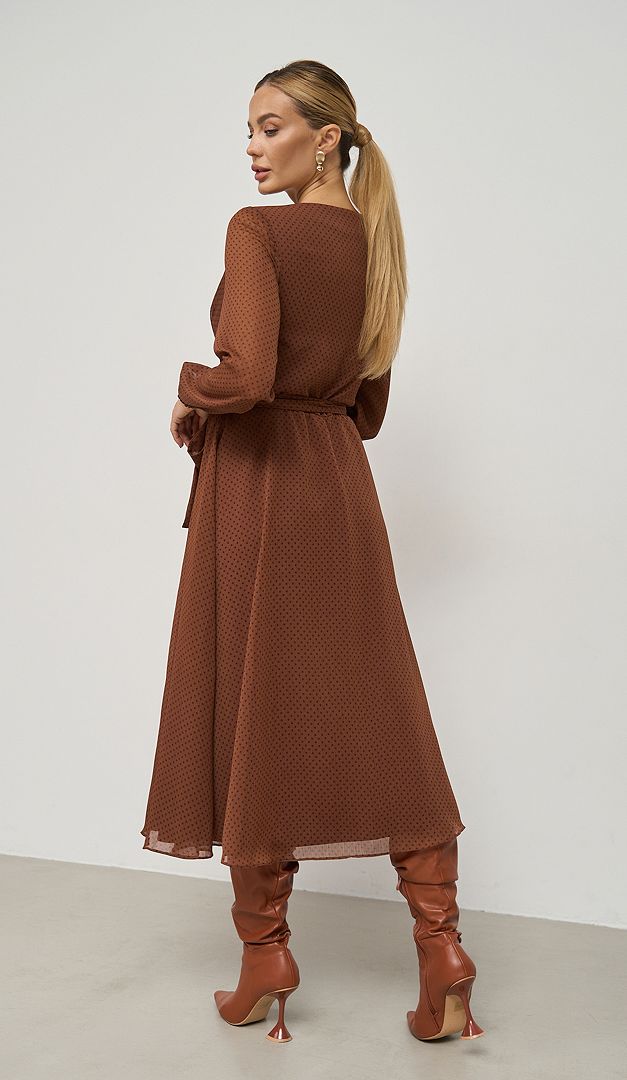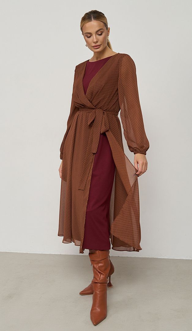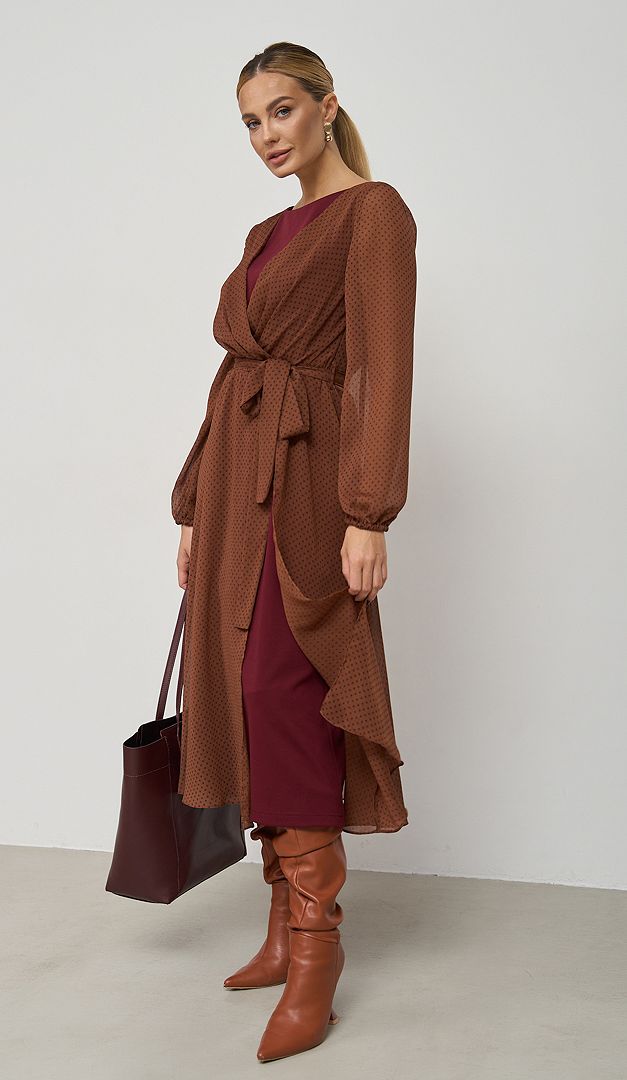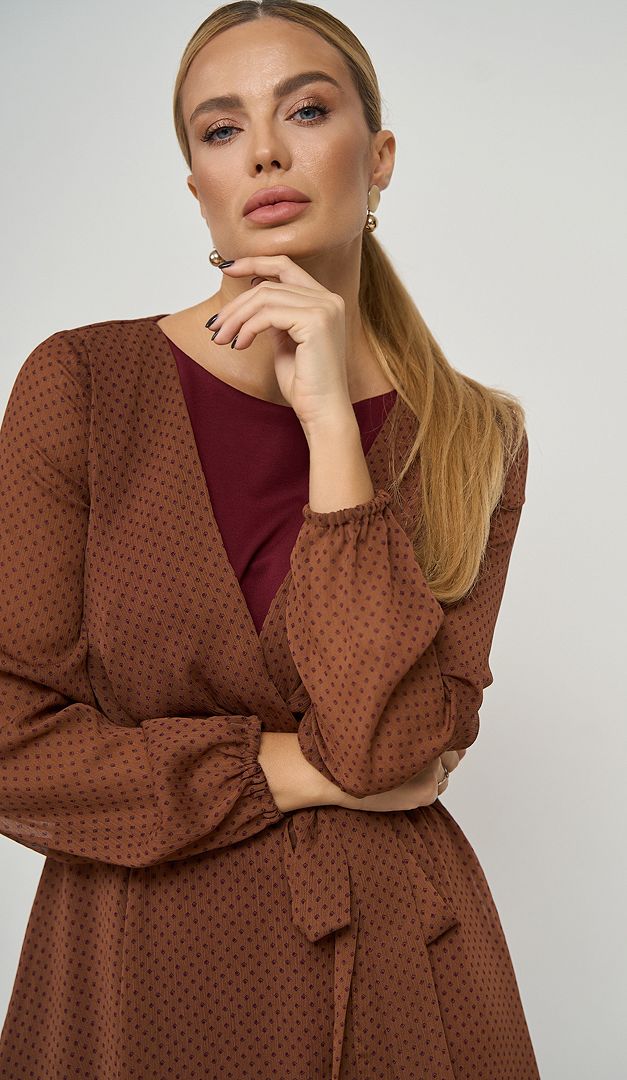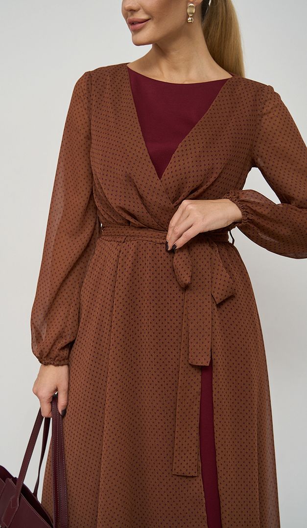 Изысканное платье шифоновое коричнево-вишневое — эталон женственности и очарования! Полусвободный крой с непринужденной плавно спадающей юбкой создадут романтический образ и грациозный силуэт. Платье шифоновое коричнево-вишневое выполнено с сочетанием двух разно-фактурных тканей: шифона и трикотажа, стильно комбинирующихся в цветовой палитре. Изделие имеет неглубокий вырез горловины, длинный шифоновый рукав, который снизу оформлен эластичной резинкой и элегантную длину миди. Линия талии – отрезная, собранная изнутри на резинку и дополнительно подчеркнутая съемным поясом. Глубокий V-образный вырез от горловины и разрез от пояса вниз шифоновой юбочной части придают особую эффектность и изящество созданному образу. Без застежек.
