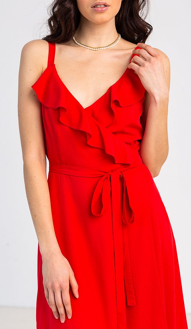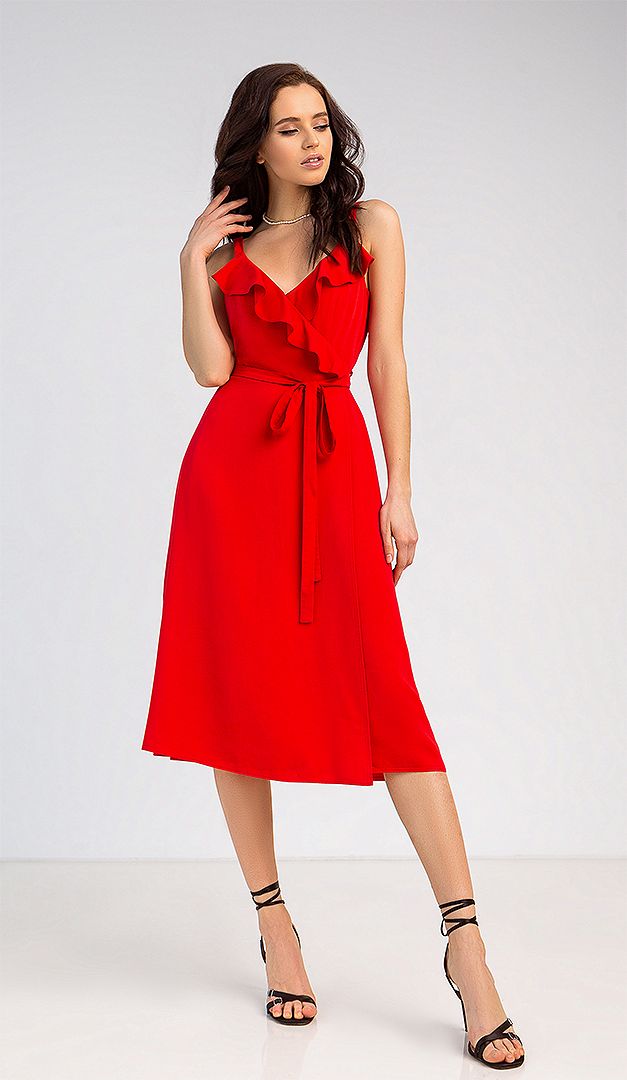 Готовьтесь к комплиментам! Красный сарафан на бретелях с воланами обязательно должен быть в Вашем базовом летнем гардеробе. Лаконичный красный сарафан, изготовленный из дышащей натуральной ткани (100% вискоза), поможет Вам создать красивый нарядный образ для абсолютно любых поводов. Красный сарафан имеет всеми любимый женственный А-силуэт на «запАх» с удобной фиксацией на поясок по линии талии. Верх сарафана на тонких изящных бретелях. Соблазнительный V-образный вырез горловины кокетливо украшен аккуратными воланами. Сарафан без подкладки.