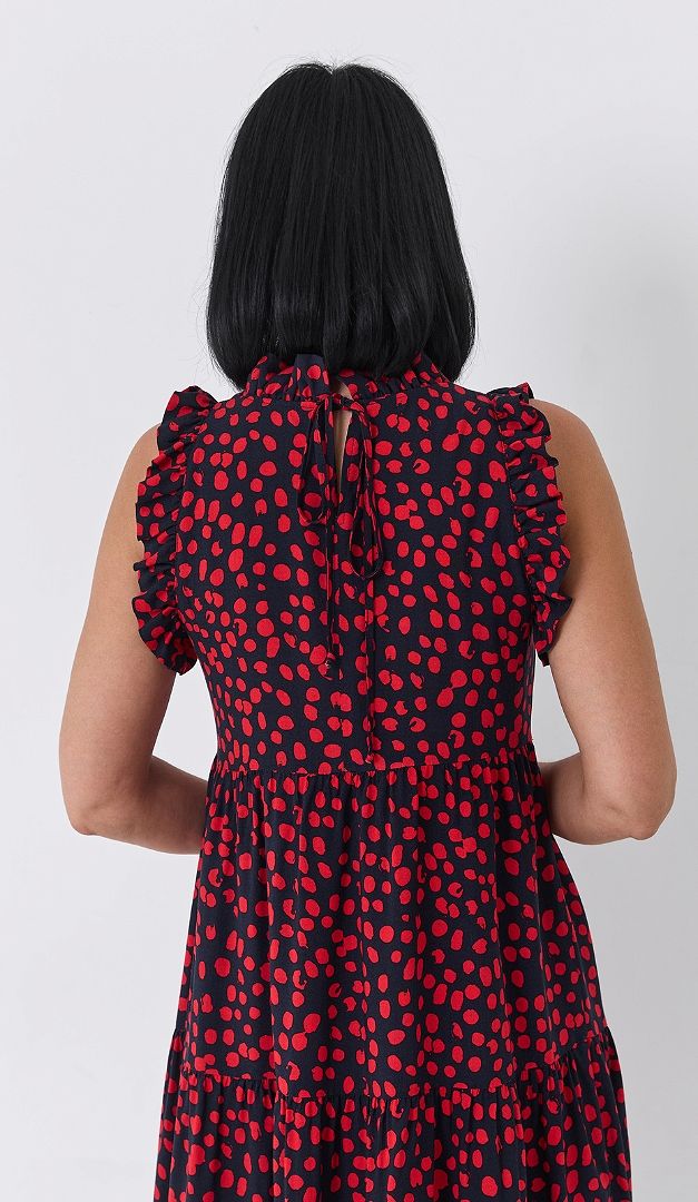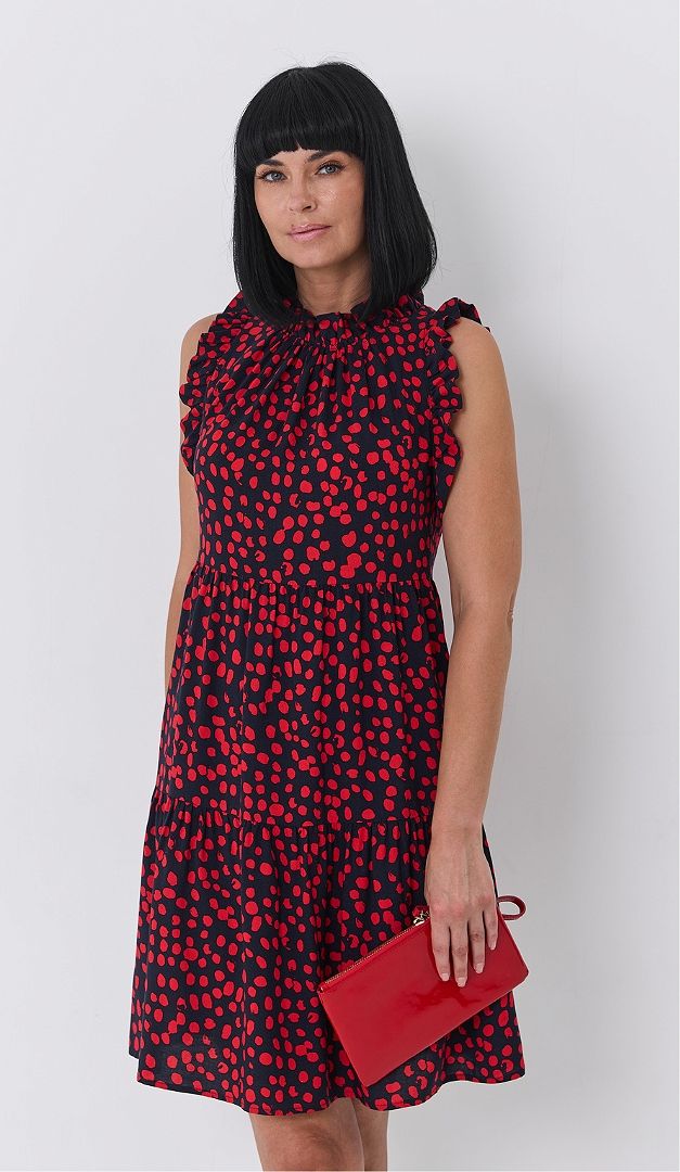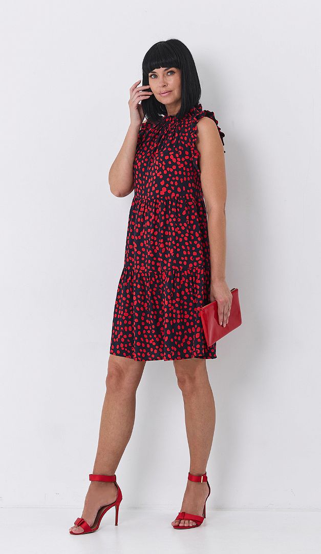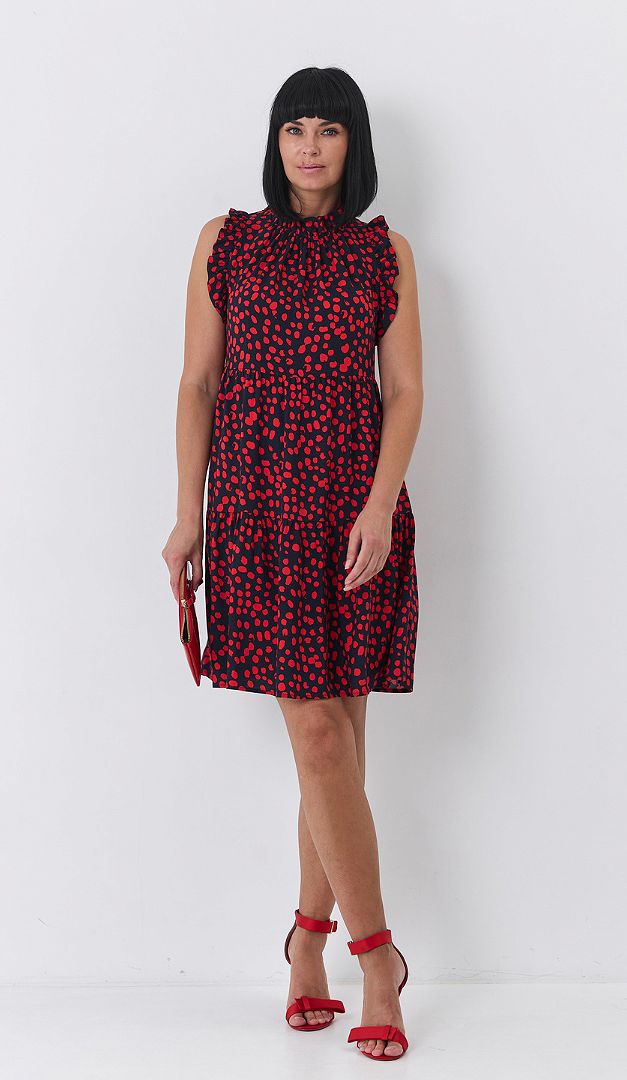 MUST HAVE для лета - это сарафан в горох с рюшами. Эта летняя модель выполнена из лёгкого немнущегося материала. Кокетливо расклешённый силуэт с завышенной линией талии и романтичными воланами подойдёт к любому типу фигуры. Закрытый верх летнего сарафана, а также — пройма рукавов украшена аккуратными мелкими рюшами. Для удобства по спинке расположена функциональная завязка и небольшой разрез. Без подкладки.