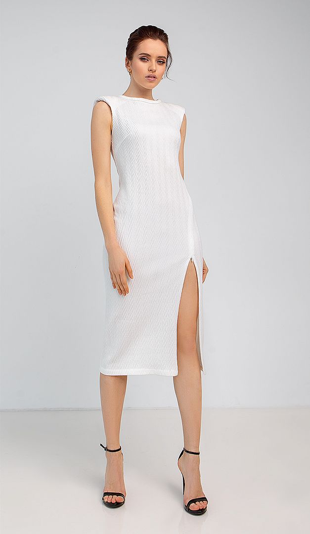 Это любовь с первого взгляда! Шикарный сарафан из фактурного трикотажа и с очень соблазнительной боковой распоркой. Длину распорки можно регулировать или вовсе скрыть, воспользовавшись функциональной молнией. Ещё одна трендовая деталь сарафана — это аккуратные накладные плечики, придающие силуэту четких грациозных линий. Эффектно облегающий крой и длина ниже колен помогут вам создать невероятно красивый и привлекательный образ! Сарафан без подкладки. Также изделие имеет застёжку на «молнию» в среднем шве спинки.