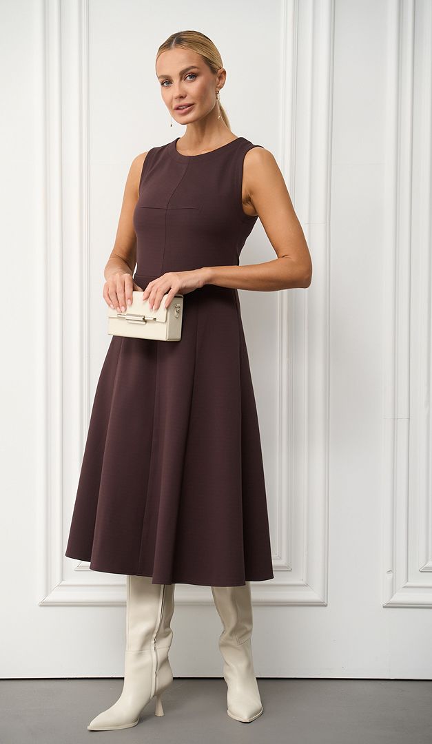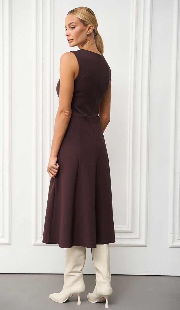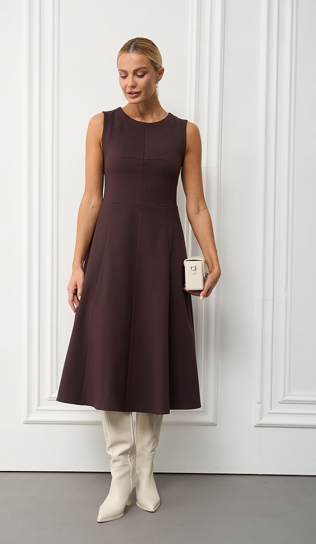 Сарафан теплый миди коричневый – базовая вещь для осенне-зимнего гардероба! Модель расклешенного книзу кроя, с неглубоким округлым вырезом горловины, отрезной линией талии и трендовой длиной миди. Сарафан теплый коричневый миди выполнен из хорошо держащей форму плотной ткани с утеплением, благодаря чему ваш образ будет выглядеть не только стильно и женственно, но и подарит ощущение полного комфорта. Изделие застегивается на практичную молнию, расположенную в среднем шве сзади и имее короткую подкладку на юбочной части изнутри.
