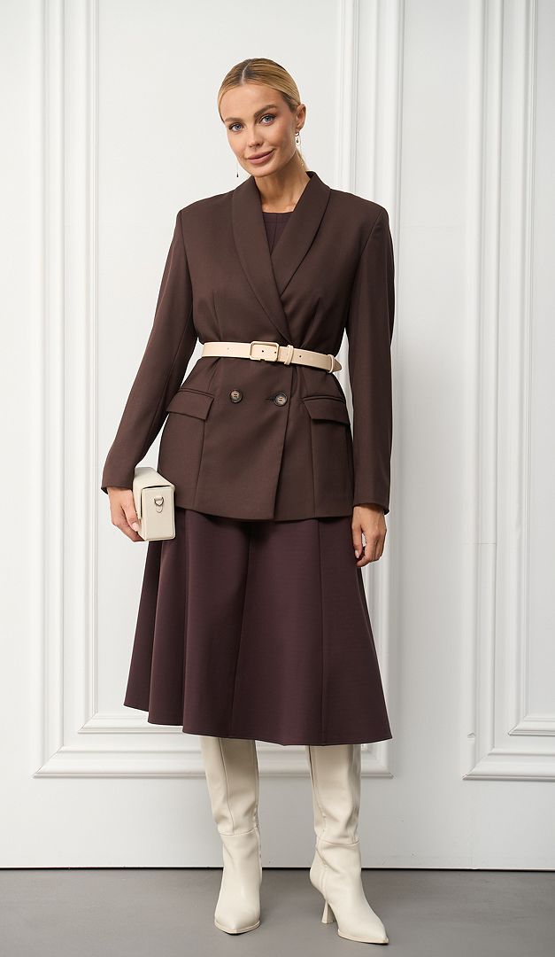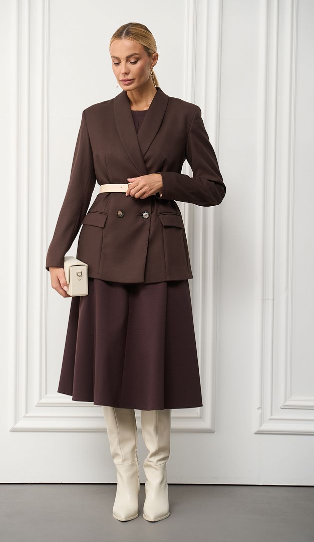 Дополнить лук можно любым гольфом, топом или блузкой из нашей коллекции. На фото создан образ с шоколадным жакетом (арт.2445).