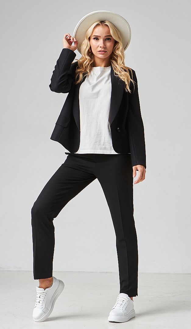 На фото создан образ с брюками классическими черными (арт.2184) и футболкой базовой молочной (арт.1728).