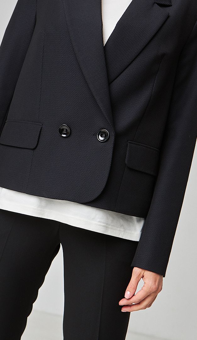 Жакет женский короткий черный – базовый элемент гардероба, который удачно комбинируется в любом стиле. Модель свободного прямого кроя с V-образным вырезом горловины, который оформлен отложным фигурным воротником и длинным удобным рукавом. Застегивается жакет женский короткий черный на двухбортную застежку на пуговицах. Перед изделия декорирован клапанами, имитирующими карманы. Модель на подкладке.