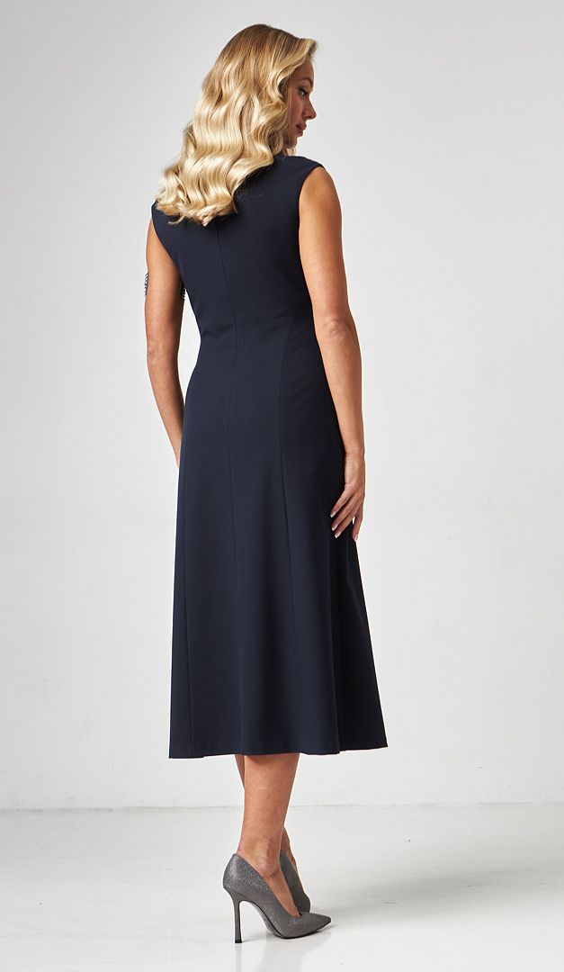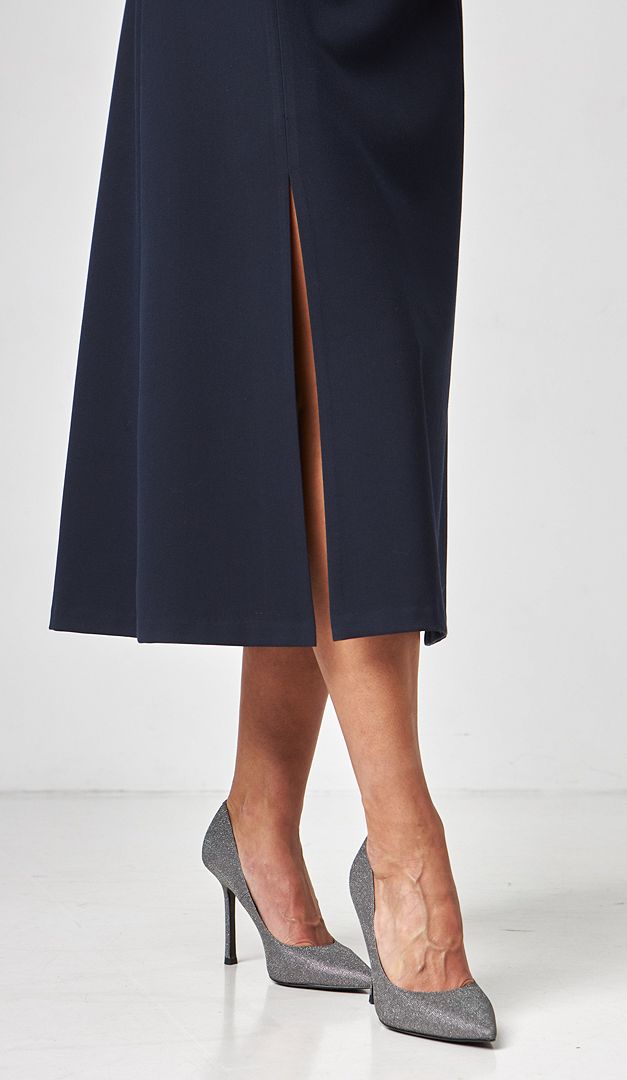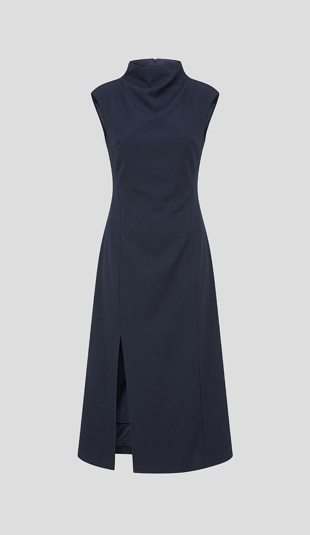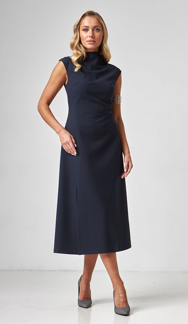 Сарафан женский миди классический синий – стильное дополнение к корпоративному гардеробу. Модель практичного А-силуэта, с элегантной длиной миди и невысокой горловиной-стойкой. Благодаря высокой асимметричной распорке снизу переда, сарафан женский миди классический синий имеет оригинальный и одновременно трендовый вид. В среднем шве задней части изделие имеет удобную застежку на молнию. Модель удачно будет комбинироваться с разнообразными блузками, гольфами и жакетами. На подкладке.