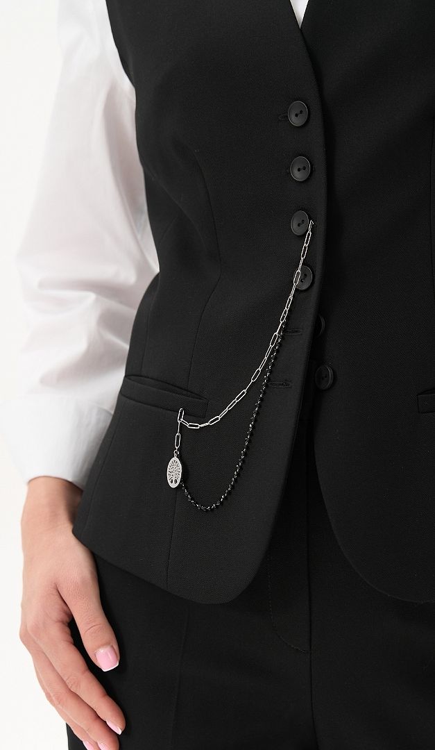 Жилет на пуговицах черный, безусловно, найдет свое место в базовом гардеробе. Модель прилегающего кроя, горловина оформлена V-образным вырезом, переходящим в удобную застежку на пуговицы. Спереди жилет на пуговицах черный дополнен двумя функциональными карманами. Лаконичность, универсальный цвет и минималистичный дизайн изделия позволят комбинировать его с практически любой блузкой, гольфом или топом. Модель на подкладке.
