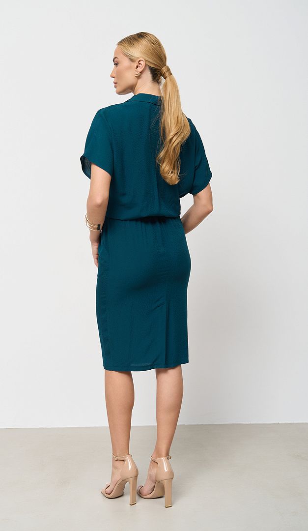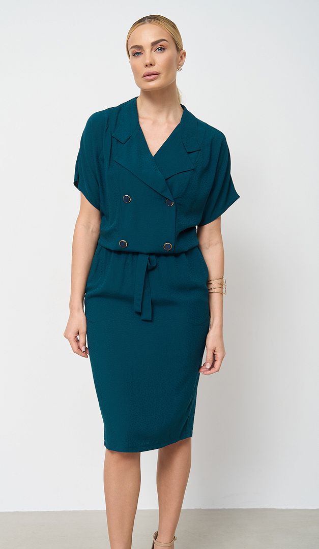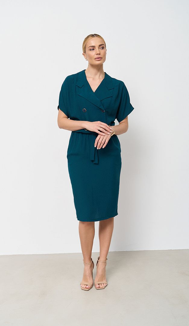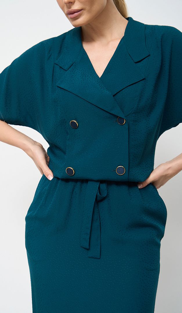 Легкое платье двухбортное изумрудное, выполненное в сдержанном классическом стиле, идеальное решение для офиса и для будней. Модель имеет элегантный прямой крой. Верх платья двухбортного изумрудного украшен фигурным отложным воротником, а также двумя рядами контрастных пуговиц, имитирующих застежку. Линия плеча прикрыта цельнокроенным свободным рукавом. На талии платье фиксируется внутренней резинкой и съемным поясом на петельках. Еще одна стильная деталь – внутренние боковые карманы. В среднем шве задней части расположена небольшая шлица. Без подложки.